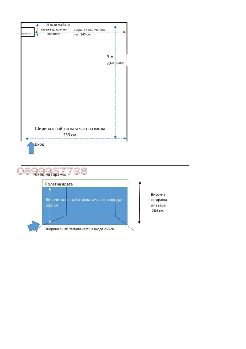 Размери вътре в гаража: най-тясната част вътре в гаража (заради колона) 240 см.; височината вътре в гаража е 264 см.; Дължината на гаража е 5 метра.