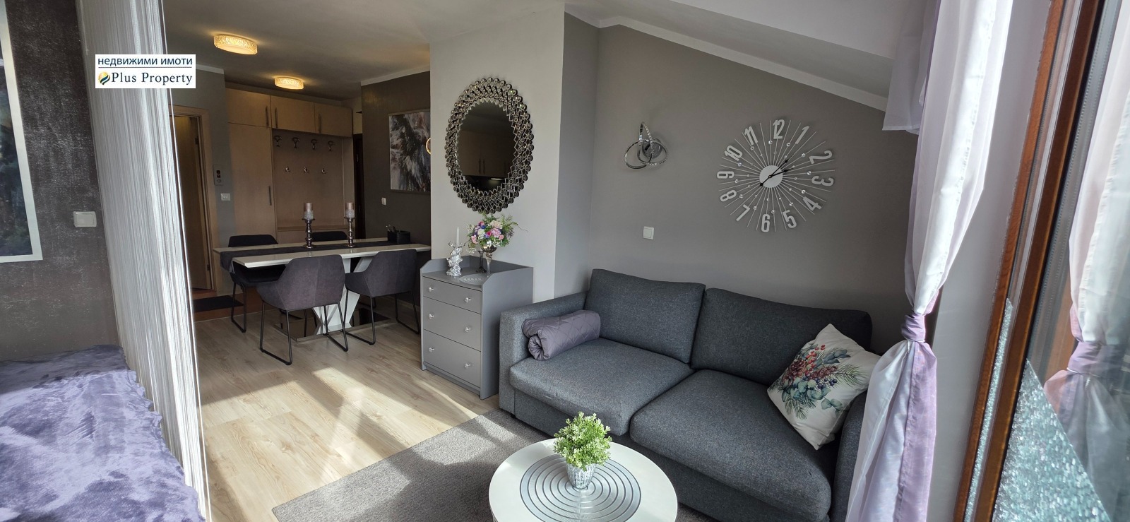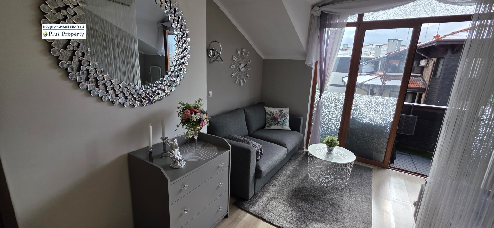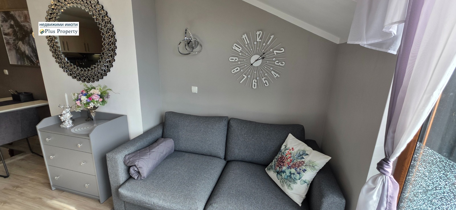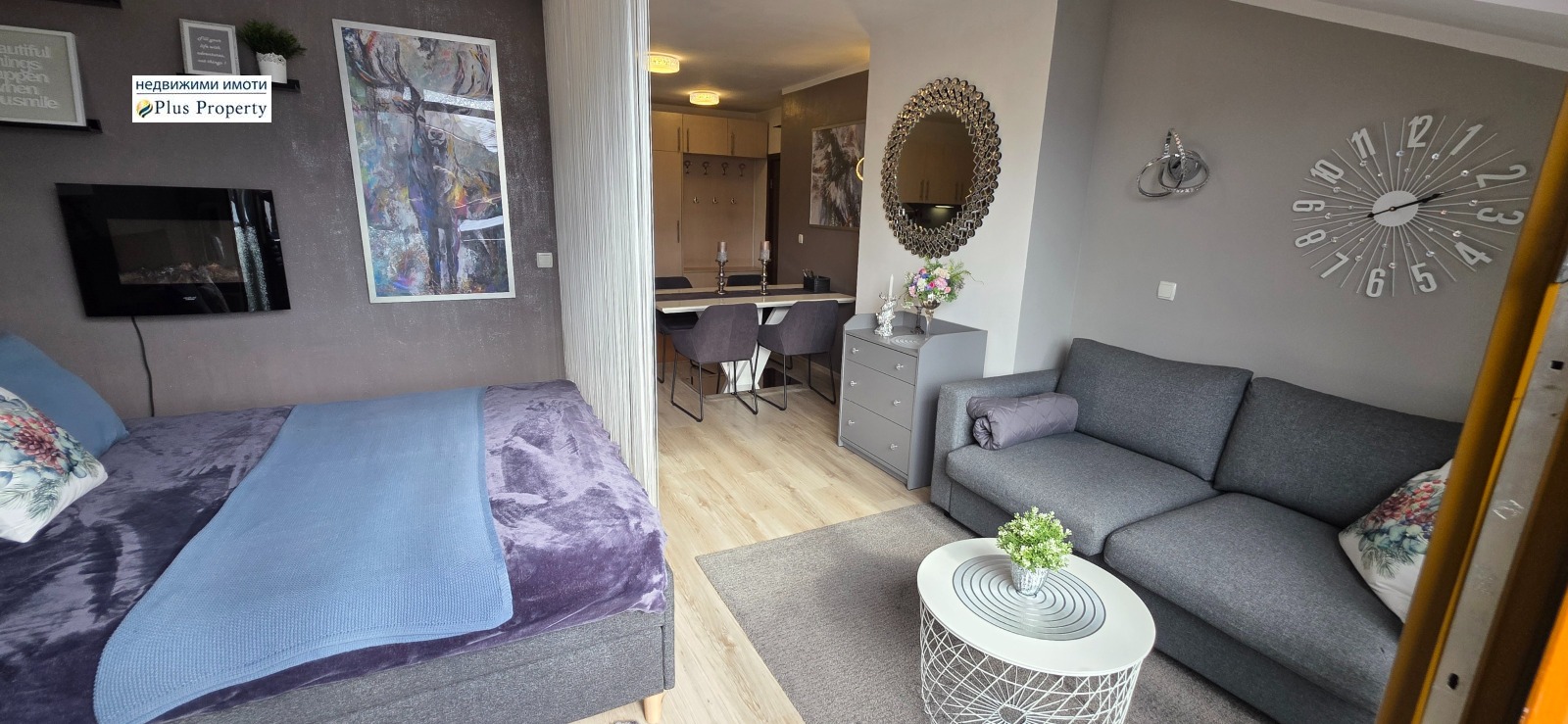 Апартаментът е обзаведен с вкус с кристални стенни лампи и впечатляващ кристален полилей, който функционира и като Bluetooth саунд система - модерен акцент!