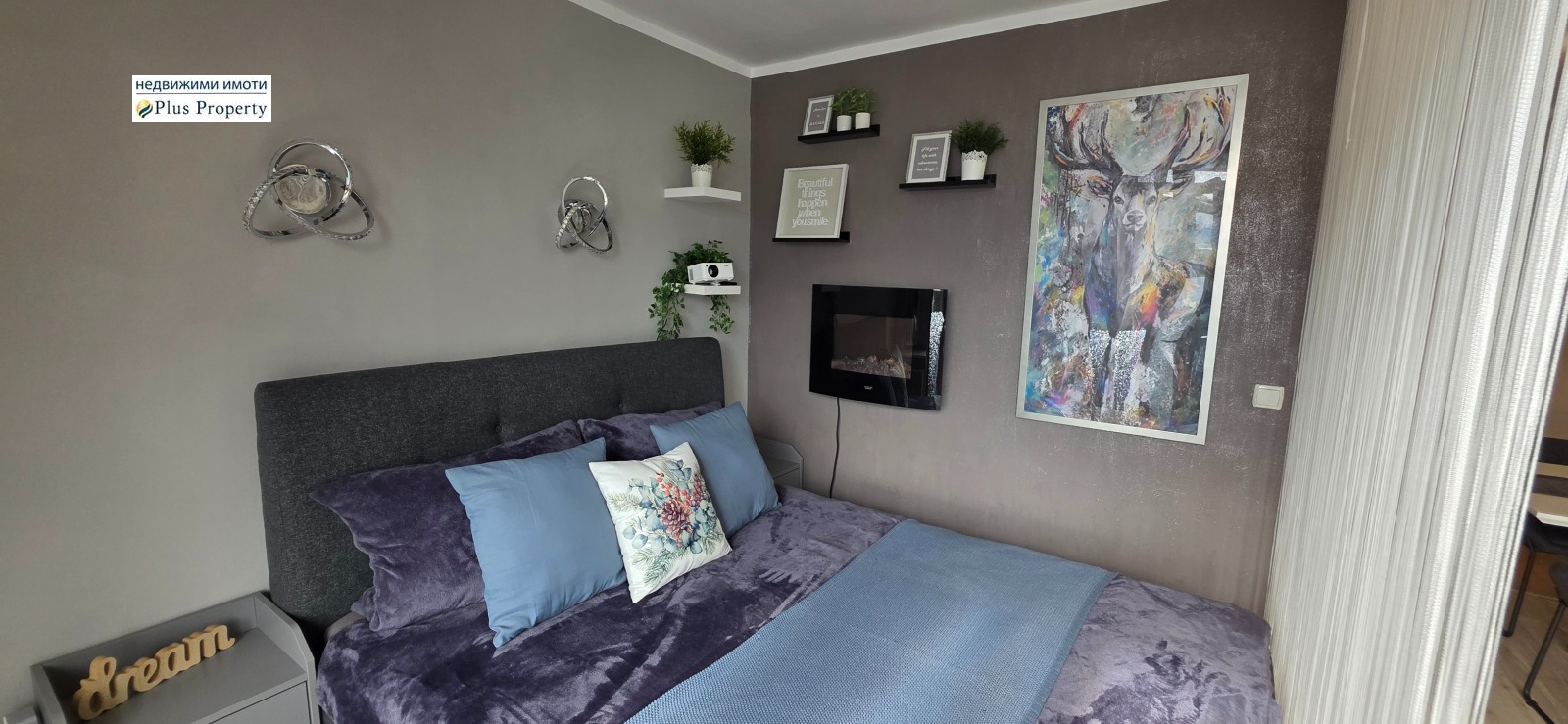 Монтираната на стената електрическа камина допринася допълнителна атмосфера за уют и топлина.