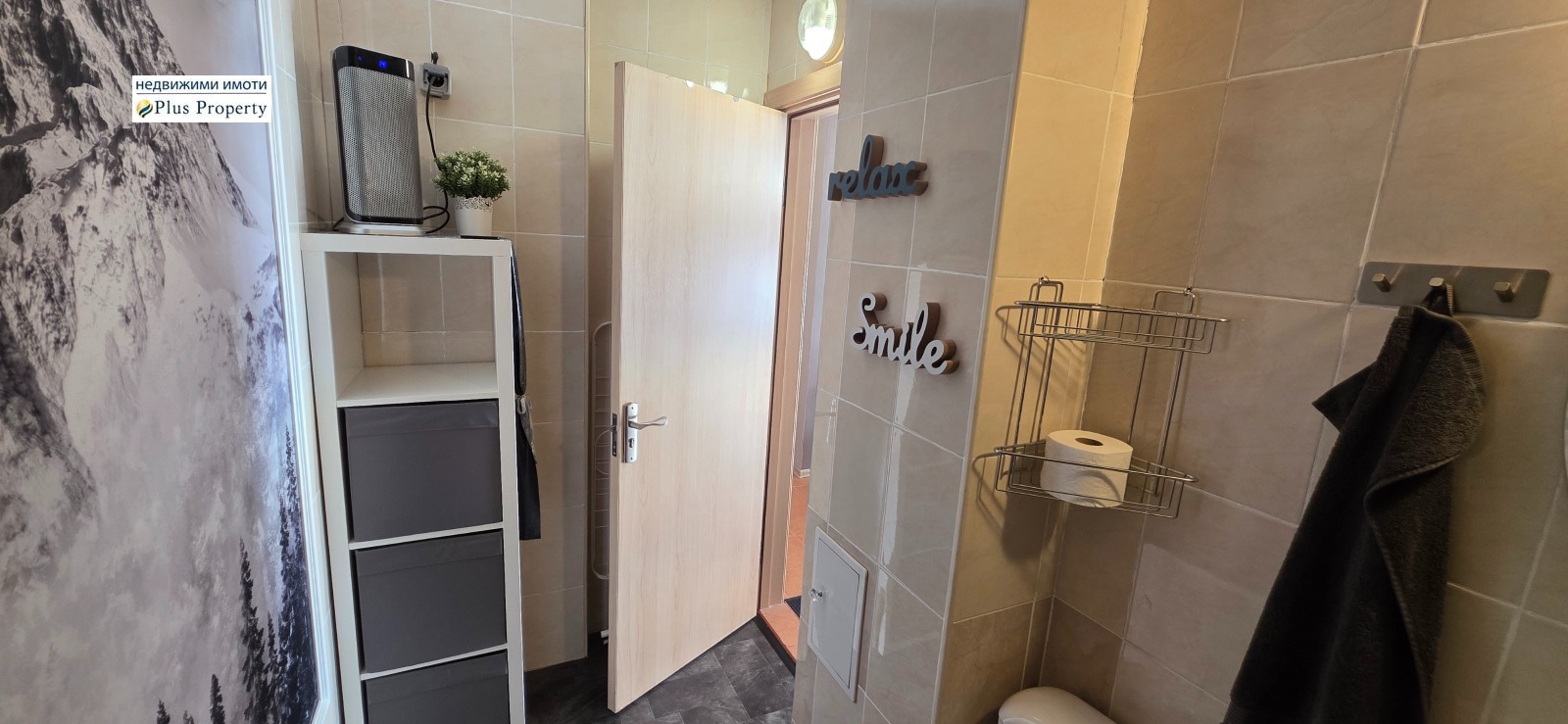 Модерна баня с душ, мивка, рафтове за кърпи и електронен бърз нагревател за допълнителна топлина в по-хладните дни.