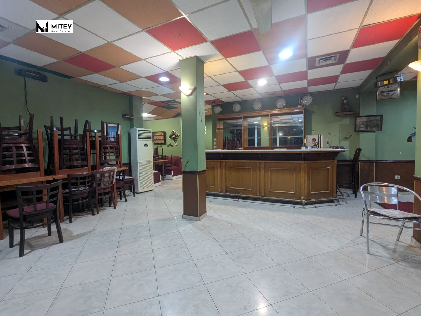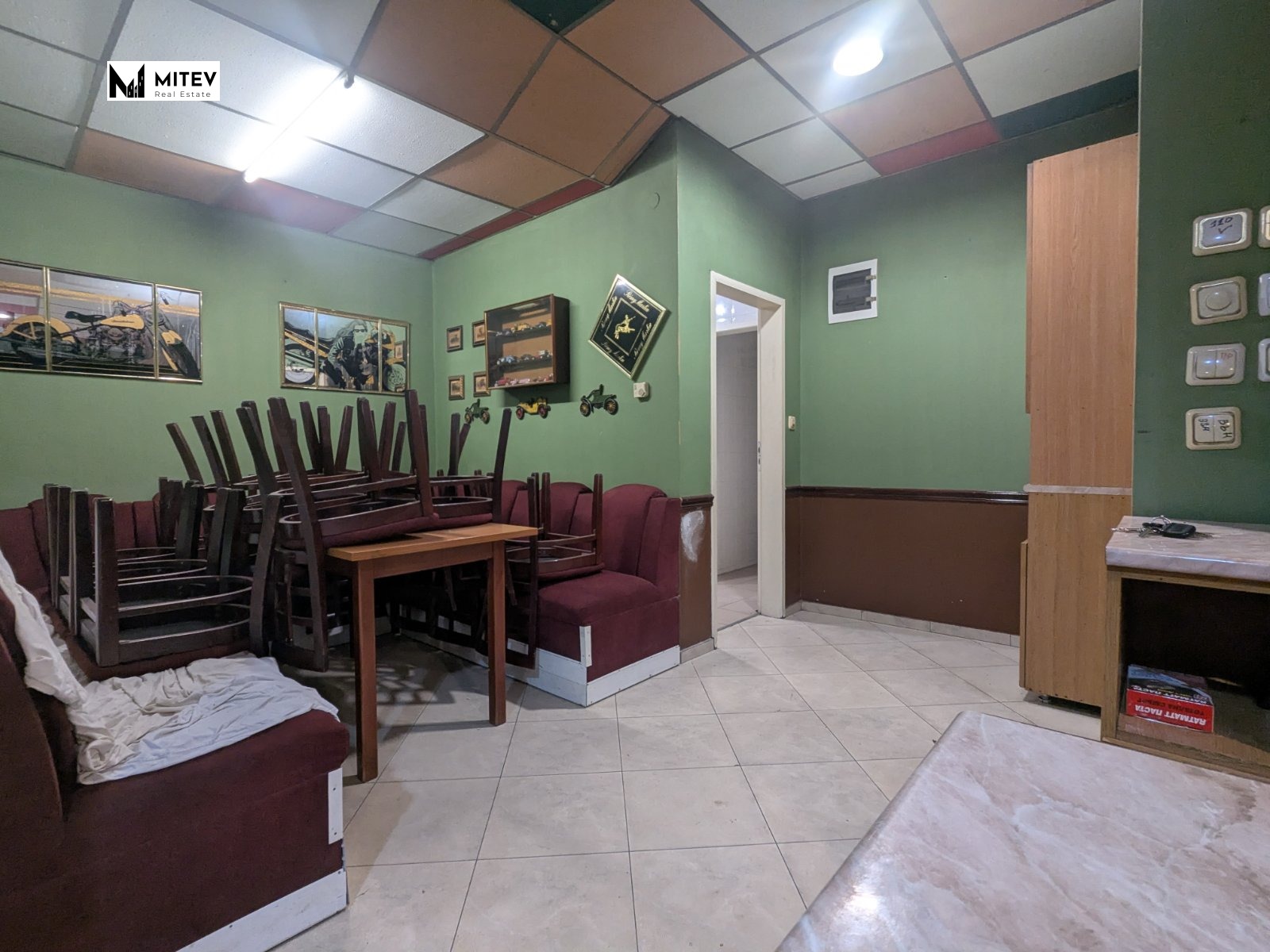 Разполага с бар, който може да бъде демонтиран, ако не е нужен за дейноста, широка зала, 2 санитарни възела, стая за персонал/кухня и сутерен, който е подходящ за склад.