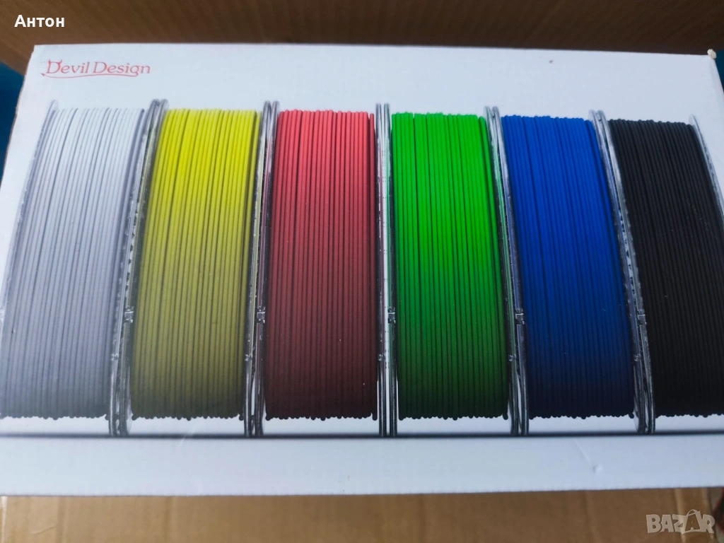 Devil Design PLA STARTPACK 1.75 мм, 6 х 0.330 кг - филамент за 3D принтер. Комплект от 6 цвята, подходящ за принтиране на многоцветни детайли. Чисто нов е, цената е за комплекта.