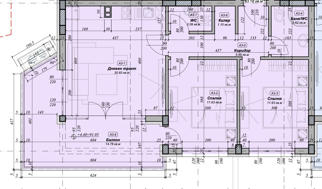 ЕРА Вива продава тристаен апартамент в новострояща се сграда в к.к. Чайка, гр. Варна. Имотът е със застроена площ от 83.18 кв.м. /95.1 кв.м. с общите части/ и се намира на втори от общо пет етажа в сградата. Състои се от входно антре, дневна с кухненска част /20.83 кв.м./, килер, две спални /всяка по 11,63 кв.м./, баня с тоалетна, отделно тоалетна и балкон. Жилището се предлага в степен на завършеност по БДС, с поставена PVC дограма и външна блиндирана врата. За повече информация вж. раздел 'План'.