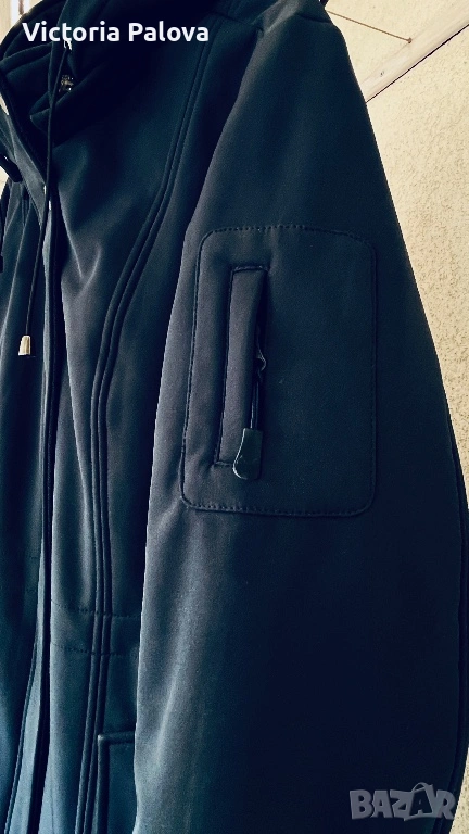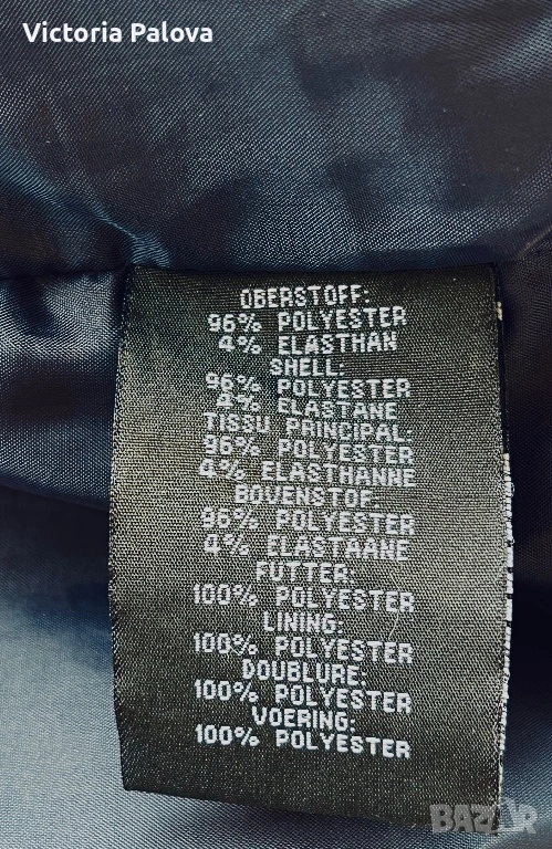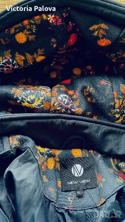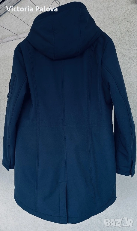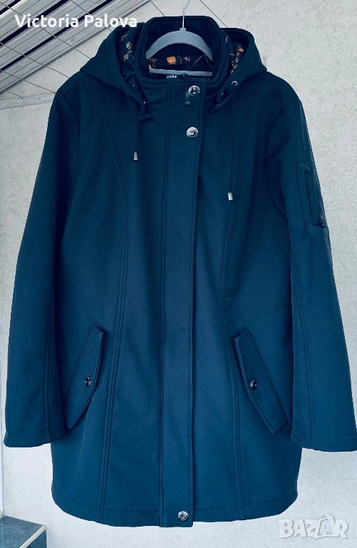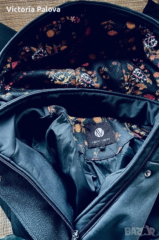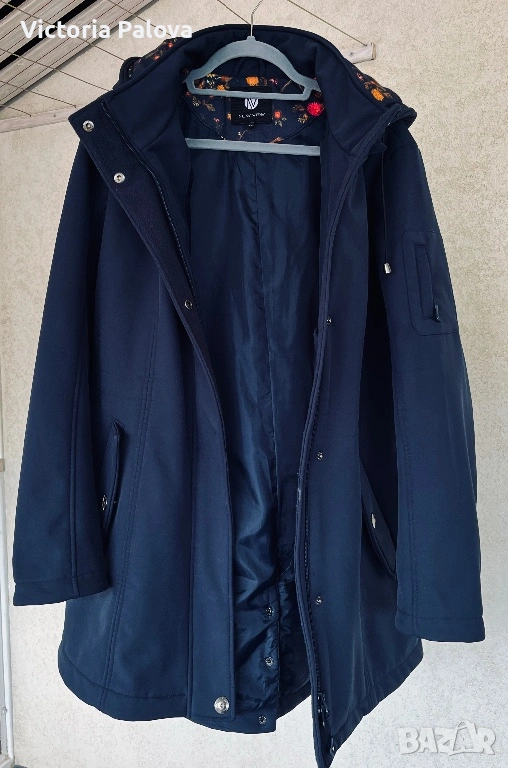 Стилно и практично дамско яке, подходящо за есен, пролет и леки зимни дни. Наситено тъмносиньо ( navy blue) . Външният материал е гладък и издръжлив - 96% полиестер и 4% еластан, което огигурява гъвкавост и комфорт при движение. Подплатата и пълнежът са 100% полиестер, за допълнителна топлина и мекота. Якето е ветроустойчиво, водоустойчиво, с регулируема качулка с красив цветен флорален принт отвътре за акцент. Централно закопчаване с цип и копчета, странични джобове, джоб на ръкава и вътрешен джоб за удобство. Дизайнът е леко притален, състоянието е отлично, без следи от употреба - идеално за разходки и пътувания. Рамо - 50см, ГО - 59см, ханш - 60см, дължина отпред - 83см, отзад - 88см, ръкав - 65см.