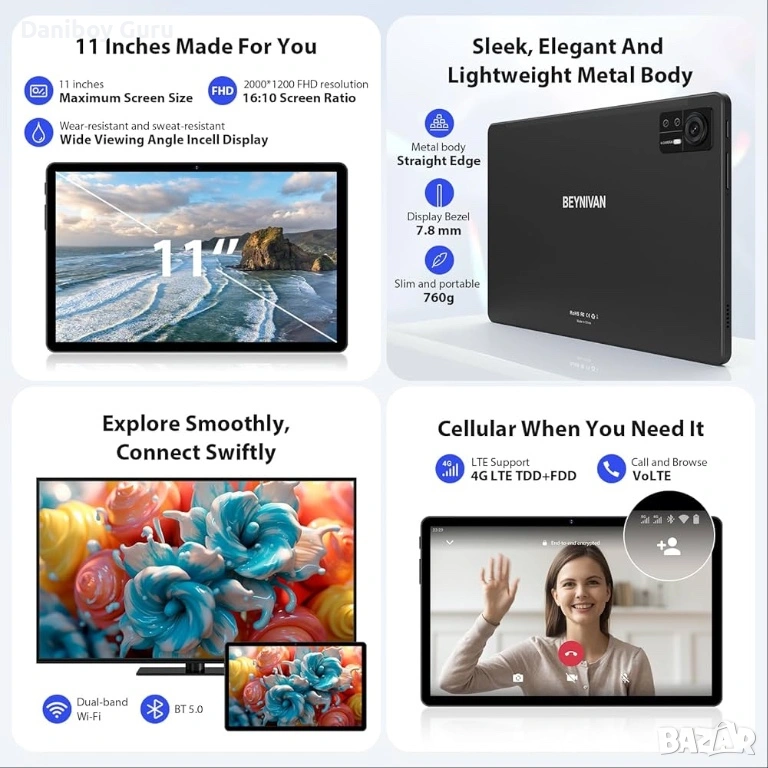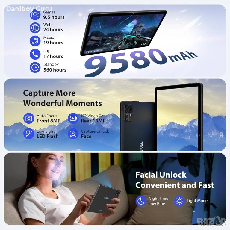Android 14 OS + осемядрен процесор. Таблетът BEYNIVAN включва новата версия на 64-битовата операционна система Android 14 OS с 2.0 GHz осемядрен процесор, който осигурява плавна многозадачност и бързо стартиране на приложения. По-бързо време за реакция и по-плавна работа с по-малко забавяне. Системата е оптимизирана и за сигурност, с най-интелигентните функции на изкуствения интелект, подобрен потребителски интерфейс, персонализируеми настройки и споделяне на разделен екран.