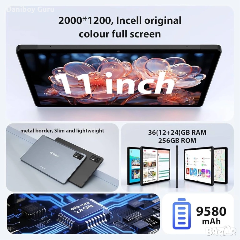 11-инчов таблет с 4G LTE и 5G WiFi, Android 14, таблет 36GB RAM + 256GB ROM/9580mAh/2000*1200