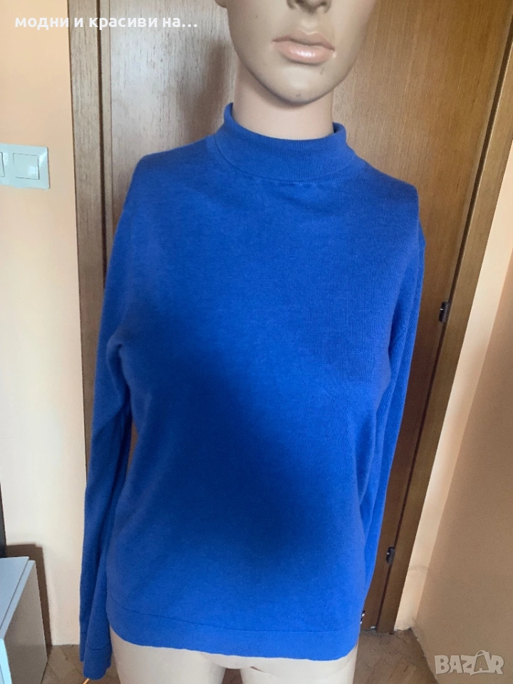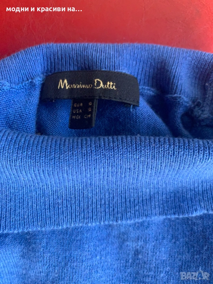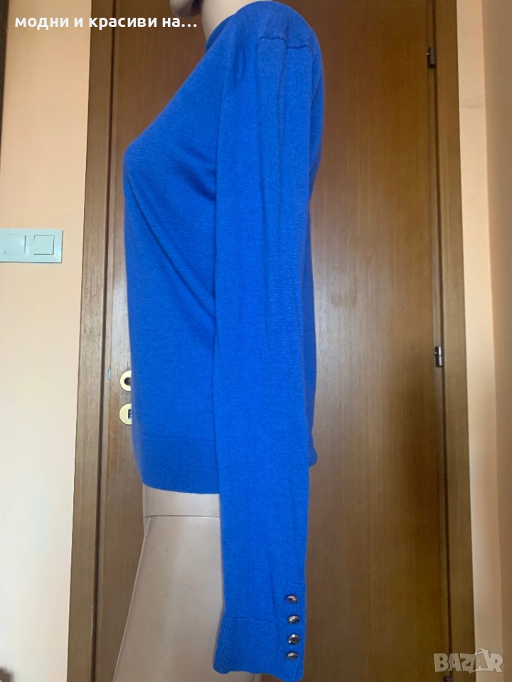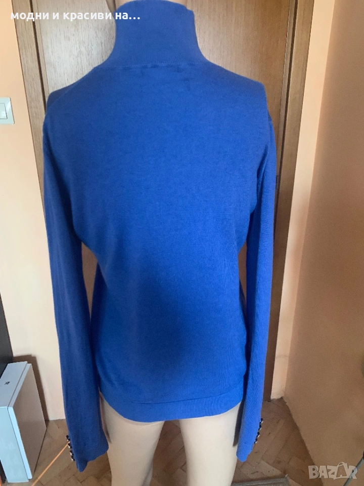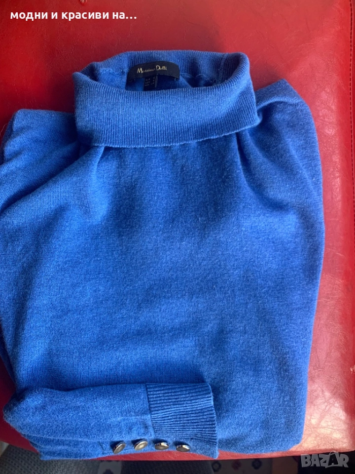 Дамско поло на Massimo Dutti в магентичен, наситен син цвят. Много фина материя- мерино (етикетът за състав е отрязан). Може да се носи с обърната поло яка или без да се прегъва, въпрос на предпочитания. Силен акцент са копчетата в завършващата част на ръкавите. По етикет е размер S, но според мен по-добре ше стои на дами с размер М-38 и дори 40. За S размер ще стои по-свободно. Има еластичност, стои много красиво, Подчертава формите и материята е много фина. Може да се носи и под сако тъй като материята го позволява. Не боцка.