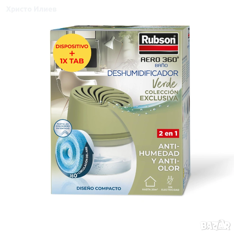 Съдържание на кутията: Rubson AERO 360° влагоабсорбатор и абсорбира миризми Компактен (зелен), против влага, предотвратява мухъл и неприятни миризми в банята, 1 устройство и 1 таблетка от 450 г