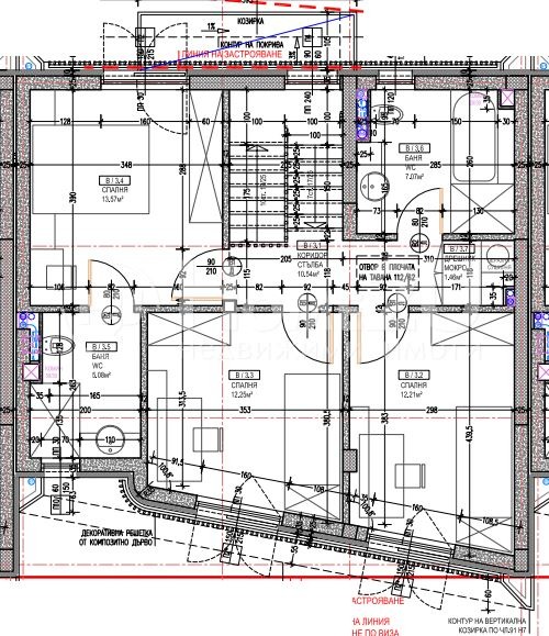Трети етаж три непреходни спални, две бани с тоалетни, дрешник/мокро помещение.