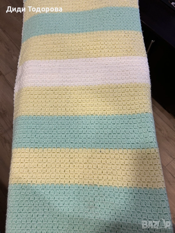 Нежна,мека ръчно плетена бебешка пелена в пастелени топли цветове - мента,бледо жълто с деликатен бял кант.Мека и приятна на допир,подходяща за всички сезони.Отлично състояние,без забележки.
