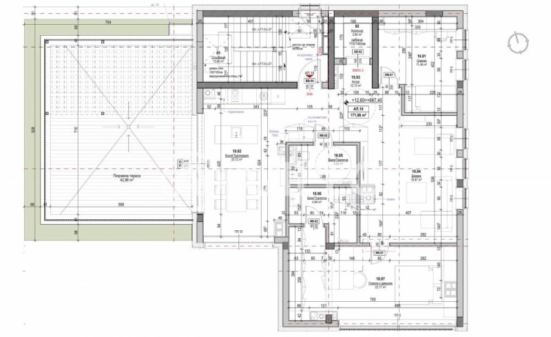 Тристаен /многостаен /апртамент разположен самостоятелно на последния етаж на сградата. Апартаментът е с 172 м2. застроена площ, от които 43 м2. тераса, който заема изцяло последния етаж и предлага пълноценен комфорт, уединение и простор.