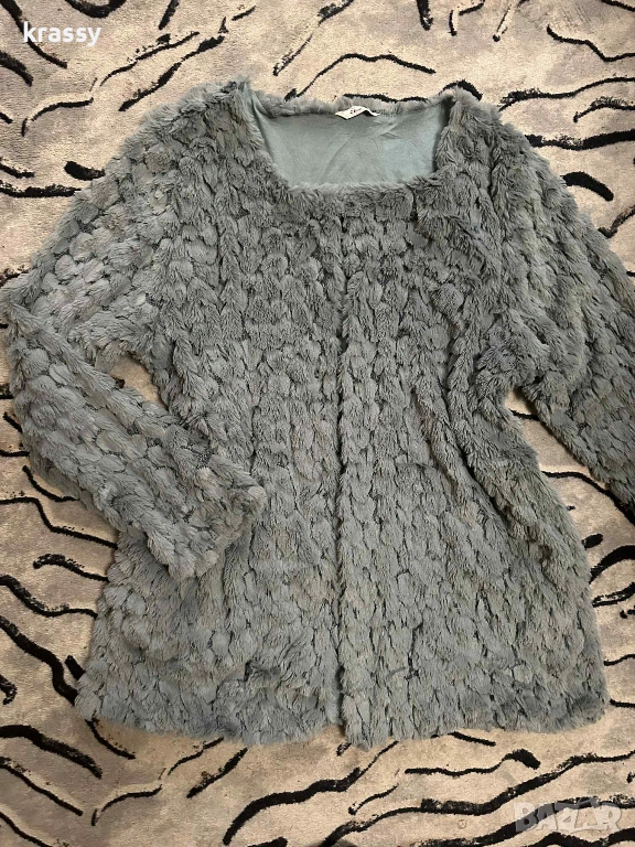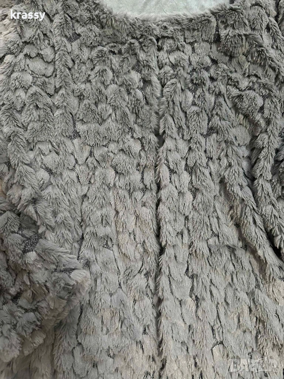 Модела е от сиво-синя еластична много мека и пухкава материя. Палтото има хастар и два странични джоба. Модела е без закопчаване. Размер 2ХЛ, ГО 120 см., ханш 130 см., дължина 75 см.