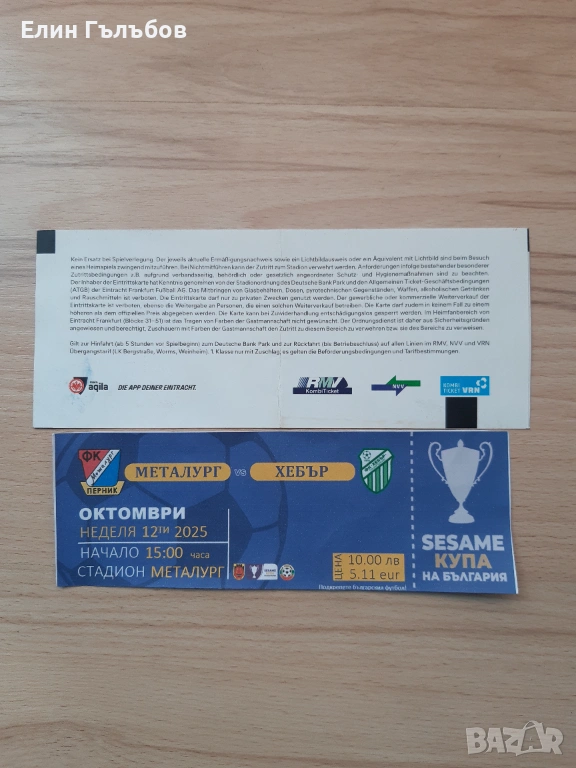 -6.Билет от мача "МЕТАЛУРГ" Перник-"Хебър" Пазарджик.Мача е за SESAME Купа на България игран на 12.Октомври-2025-та год. на Стадион "Металург" в пернишкият квартал Изток.Мача завършва при резултат 1:8 за отбора на "Хебър".