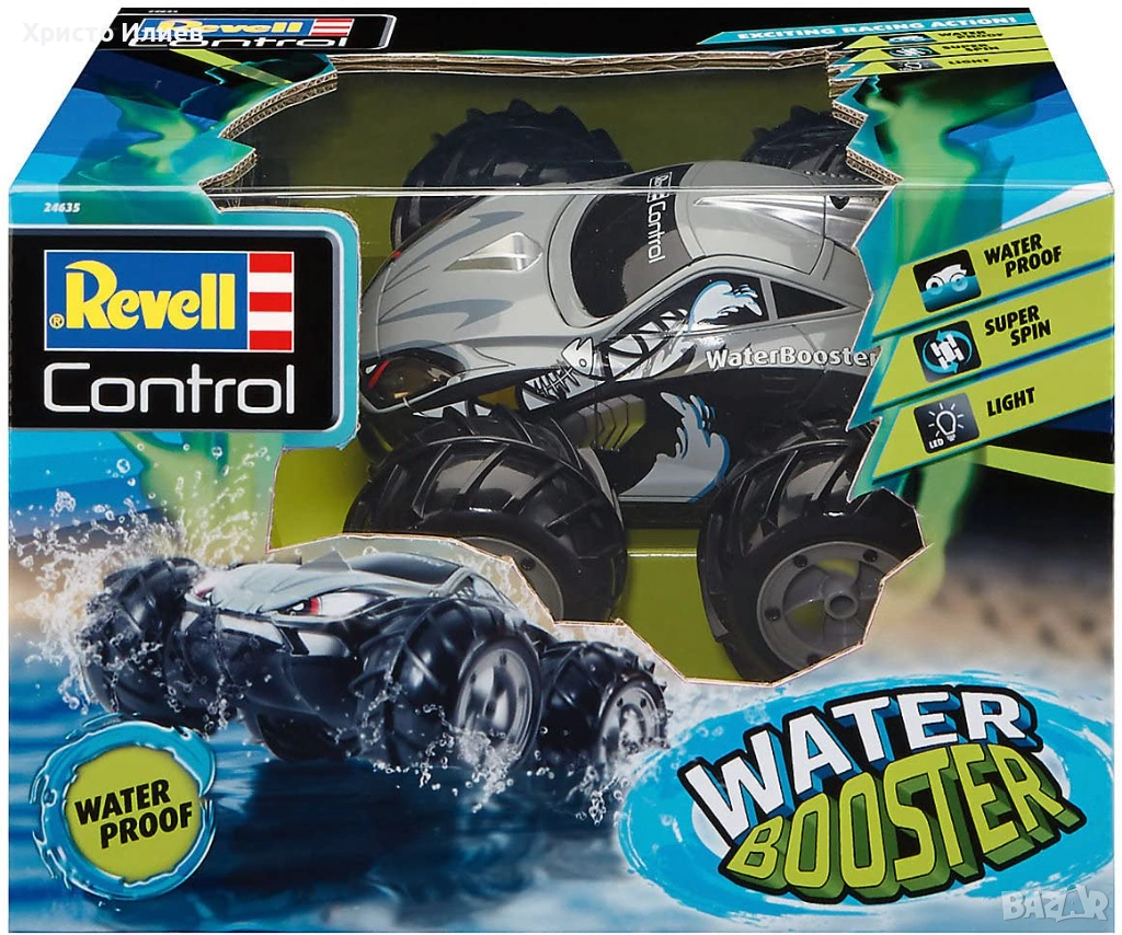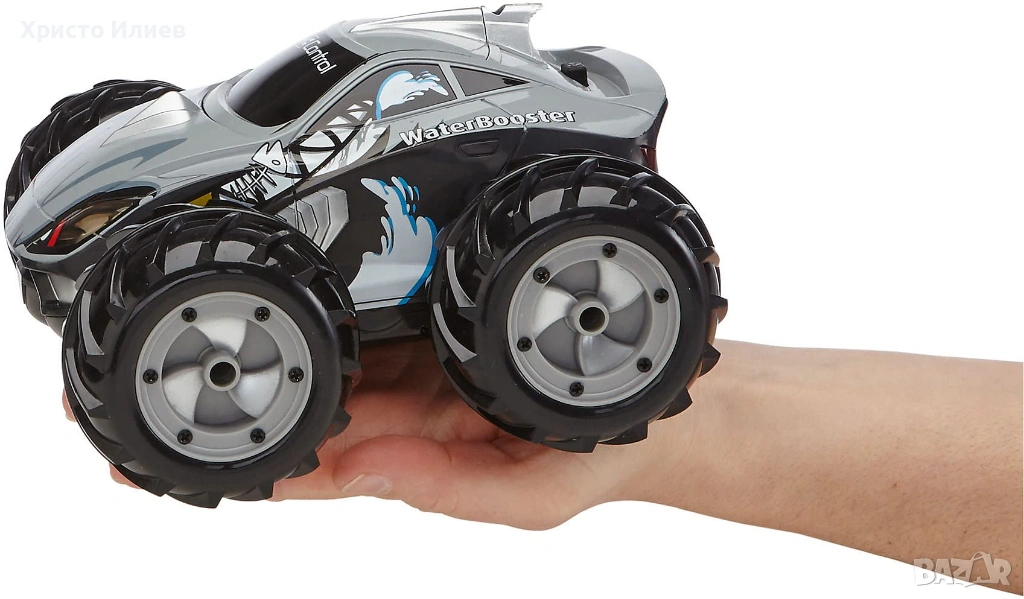 Новият WaterBooster обещава RC автомобилни приключения на сушата и водата. Удобното 2-канално дистанционно управление от 2CH GHz осигурява пълен контрол, а сигурните големи гуми осигуряват максимално сцепление. Обхват 30 метра. Необходими 1 x 9V батерия за дистанционното управление. ( не са включени в комплекта). Възраст: 8+