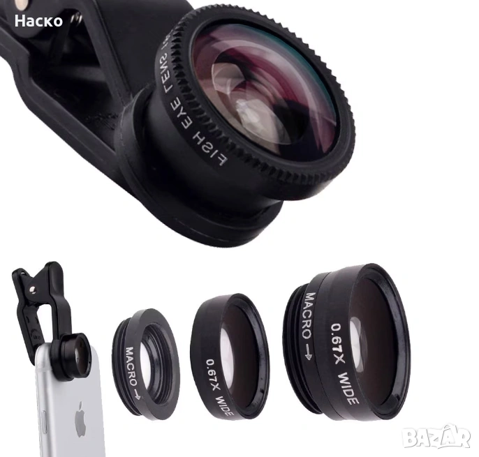 обективи и един брой универсална щипка за закрепяне към телефона. Лещите са