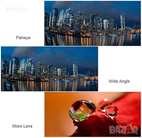 макро, широкоъгълна и рибешко око, като широкоъгълната и макро лещата са