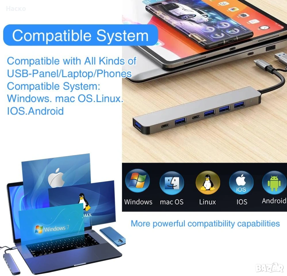работа. Включва 1 USB 3.0 порт (5Gbps), 4 USB 2.0 порта, 1 USB C PD порт за