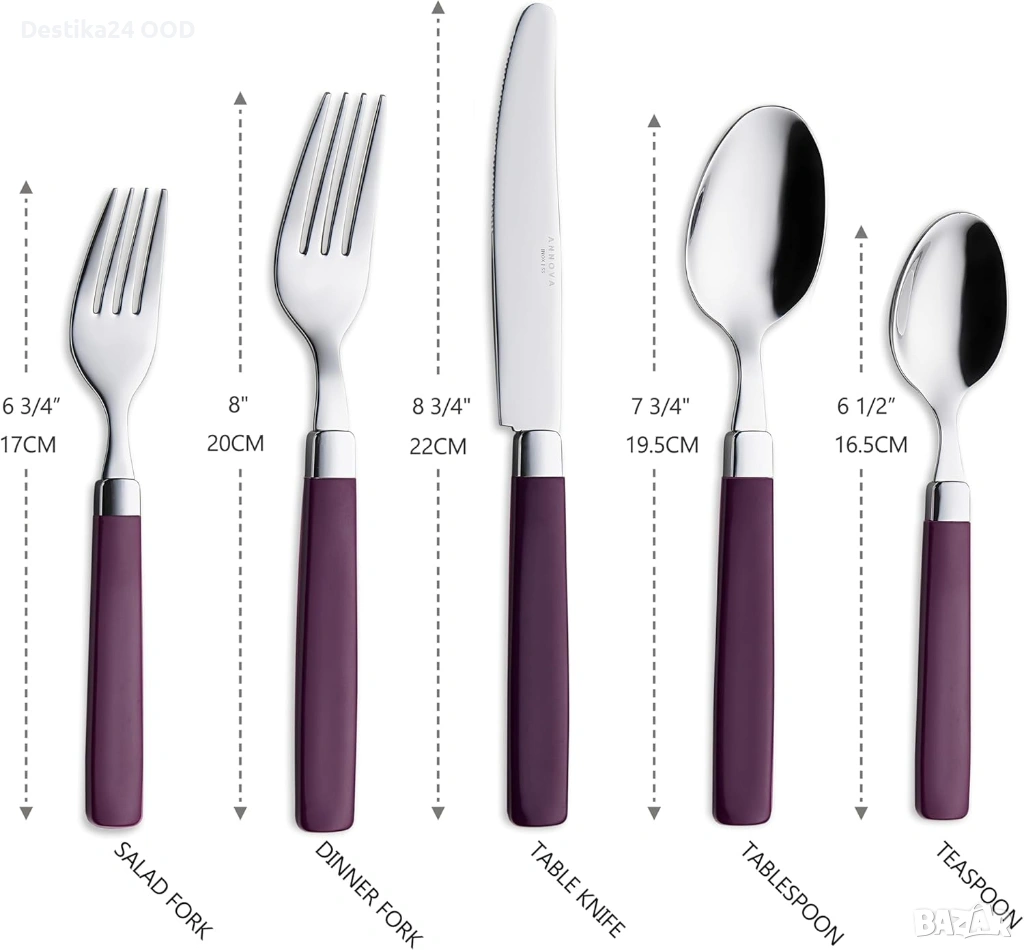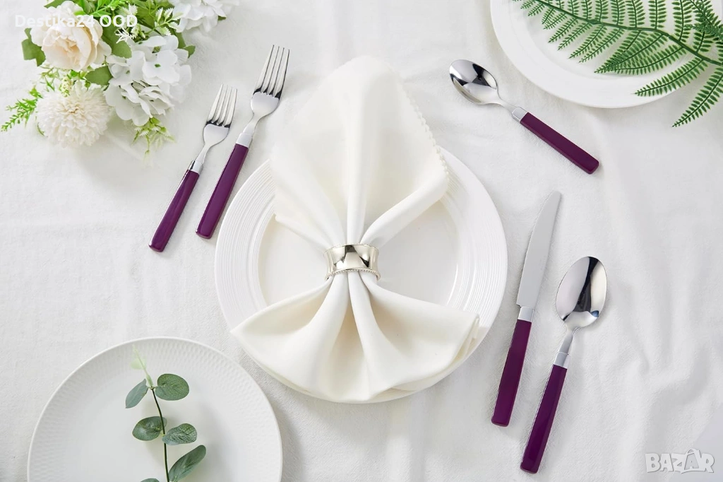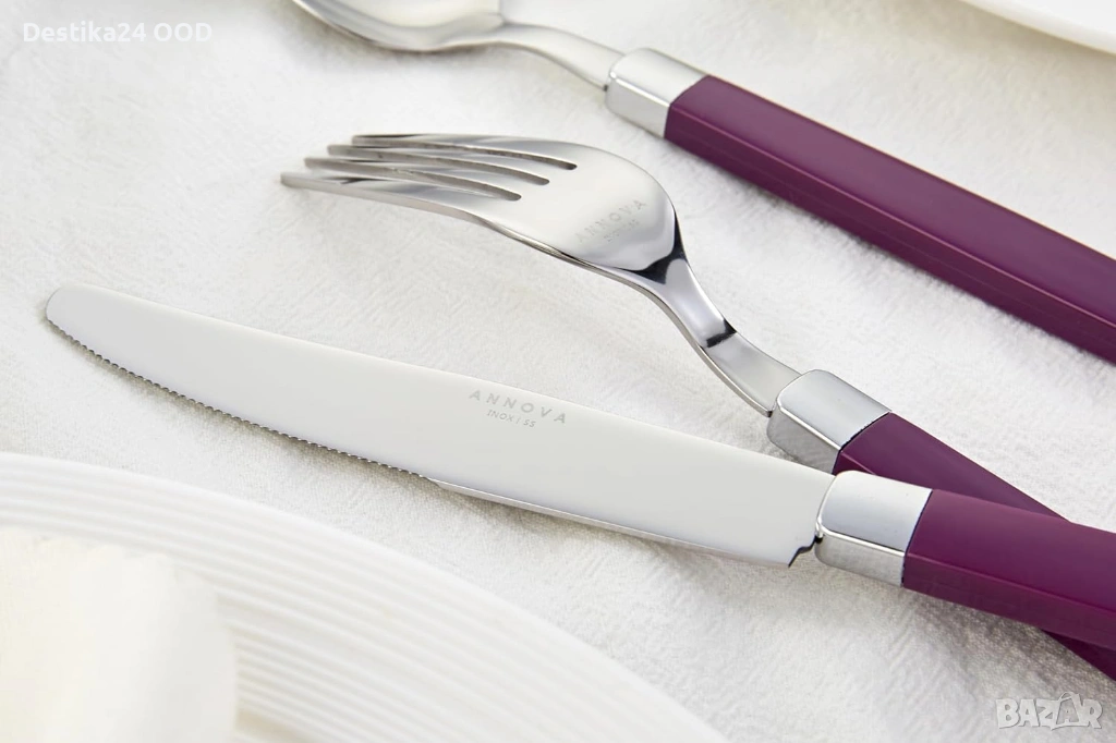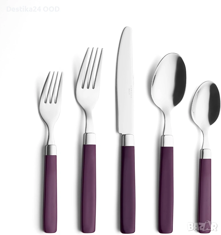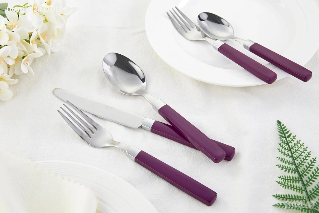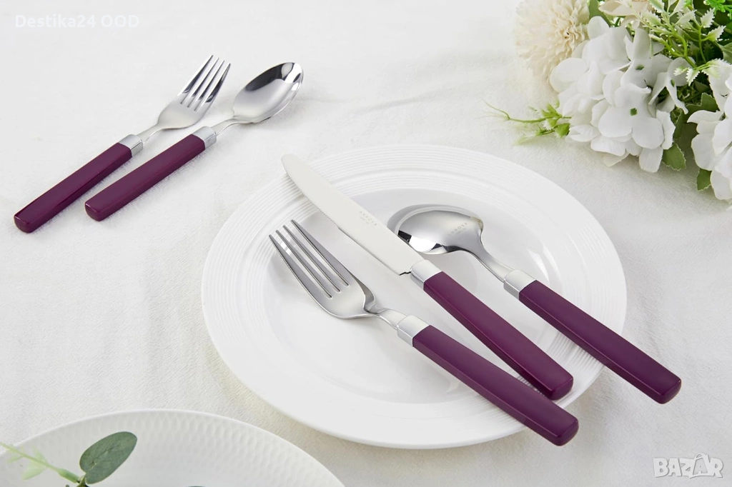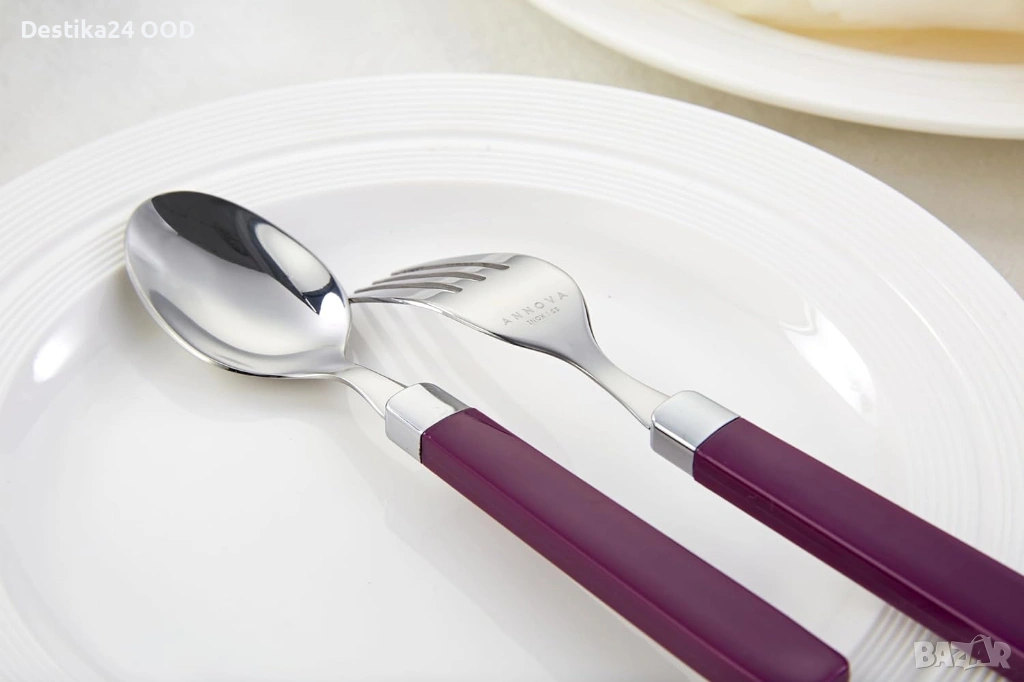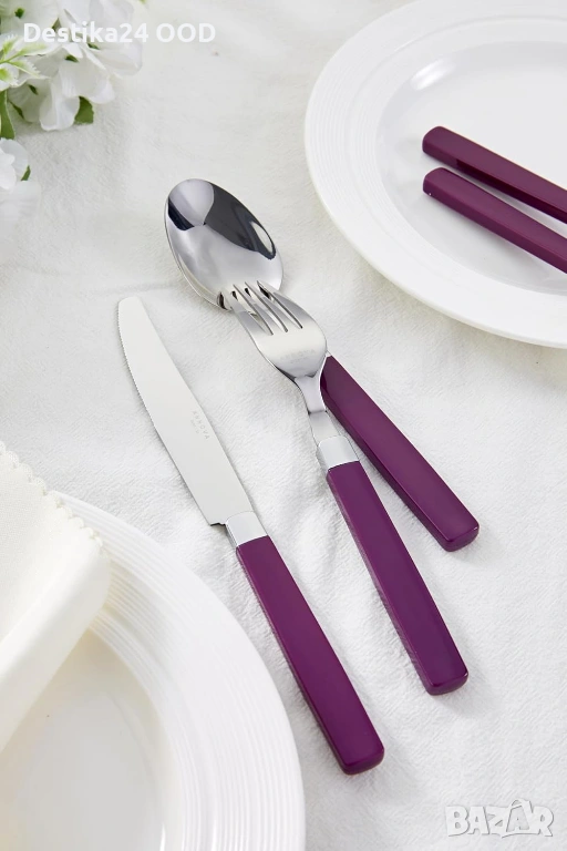 Продавам комплект прибори от неръждаема стомана с лилави дръжки. Подходящ за ежедневна употреба, семейни събирания, партита, пикник, къмпинг или пътуване.