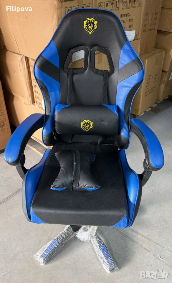 Ергономичен геймърски стол с масажна функция и поставка за крака – черно-син