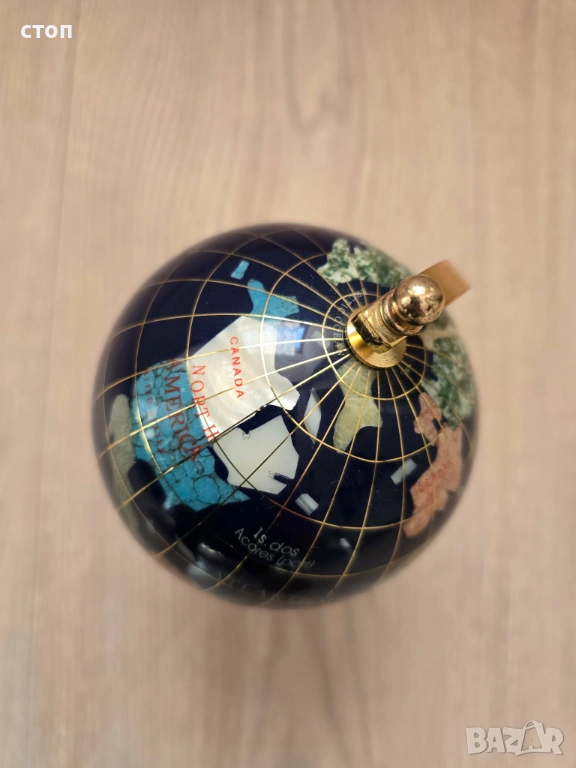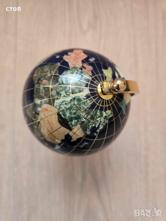 Настолен глобус, изработен от полускъпоценни камъни и минерали. Океаните са представени от лапис лазули /син цвят/, а отделните държави и континенти са инкрустирани с различни минерали като седеф, кварц и други естествени камъни. Всичко е ръчна изработка. Височина 17 см, диаметър на основата 8см и диаметър на глобуса 10см.