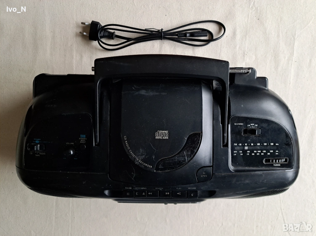 Устройството е в много добро външно и техническо състояние. Всичко работи. Поддържани радиовълни: LW /MW / FM/ FM-stereo. CD плейър. Работещ касетофон.3,5 mm жак за слушалки. Ултра бас. LCD дисплей. Захранване 230v или 6 R 20 батерии. Включен захранващ кабел. Изпращам само с Еконт с преглед и тест. Крайна цена.