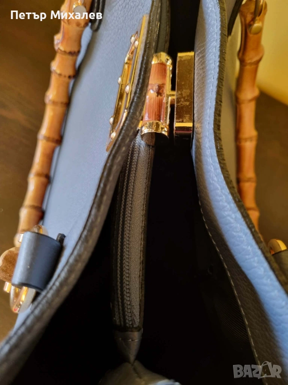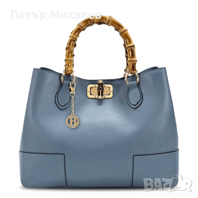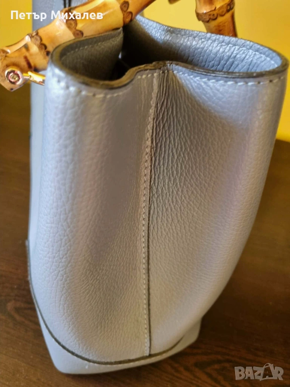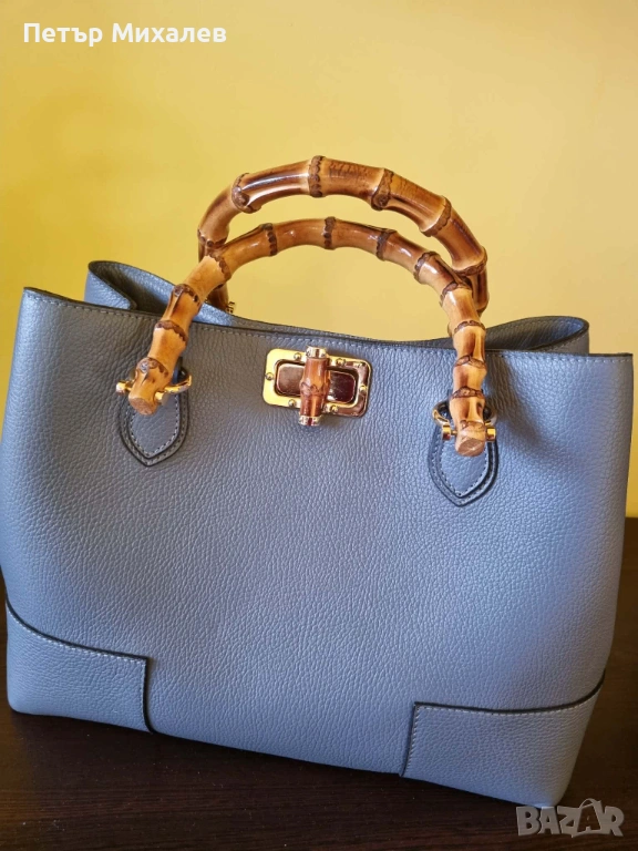 Чантата е нова, естествена кожа, пастелен син цвят,с бамбукови