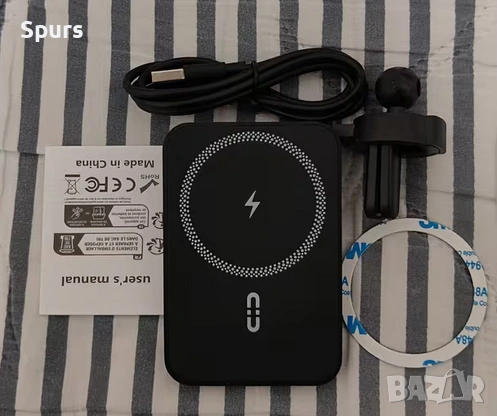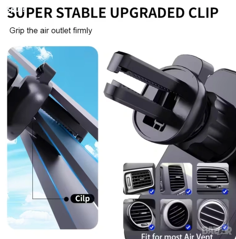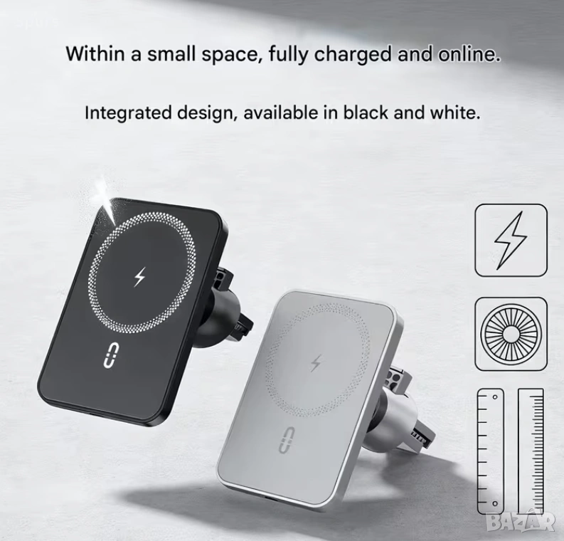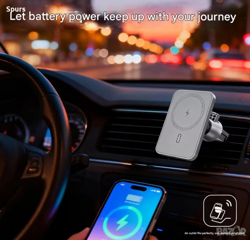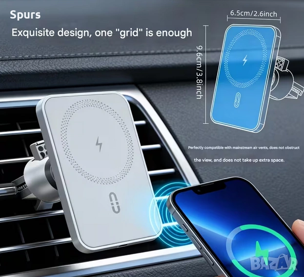 Магнитно безжично зарядно за кола 15 W, подходящо за смартфони като iPhone 17, 16, 15, 14, 13, 12, 11 Pro/Max/Mini и Samsung Galaxy S24, S23, S22. Зарядното използва магнитно позициониране за стабилно закрепване на телефона при каране, а мощността до 15 W осигурява бързо и удобно зареждане по време на път.