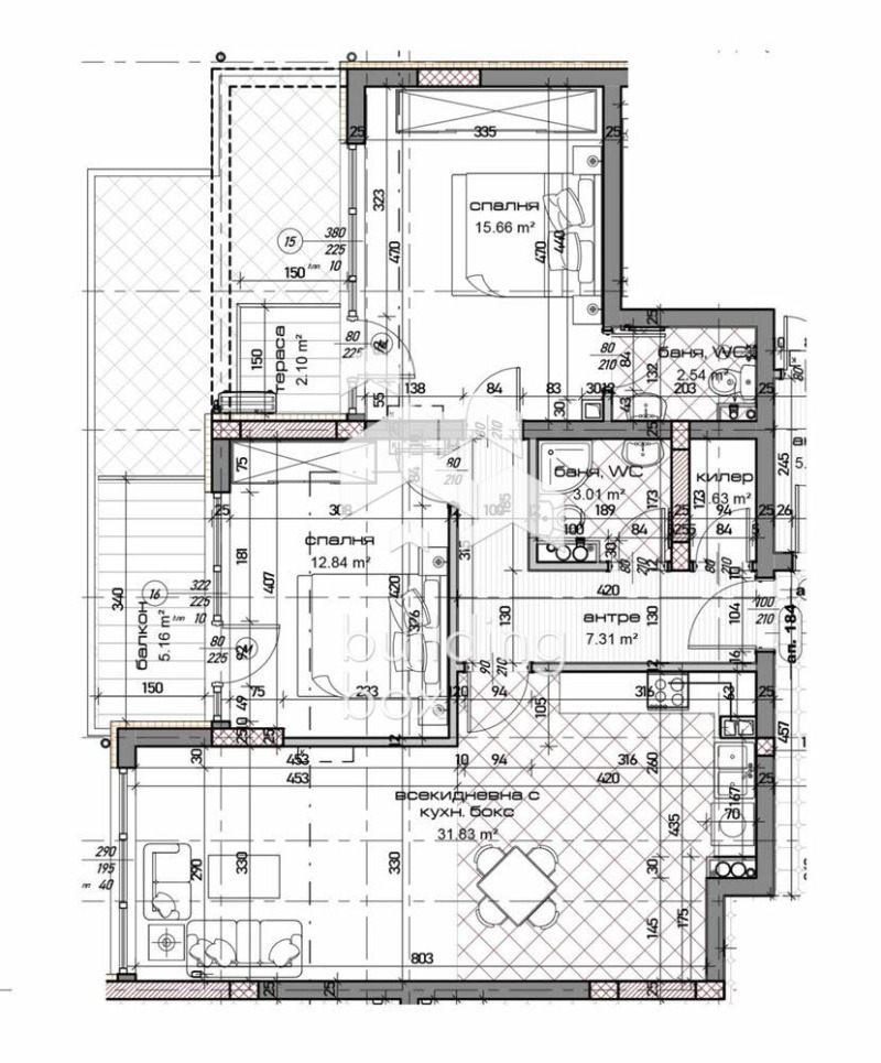 РАЗПРЕДЕЛЕНИЕ: Всекидневна с кухненски бокс - 31,83 кв.м., спалня - 12,84 кв.м., спалня - 15,66 кв.м., баня с тоалетна - 3,01 кв.м., баня с тоалетна - 2, 54 кв.м., входно антре - 7,31 кв.м., балкон - 5,16 кв.м., балкон - 2,10 кв.м., килер - 1,63 кв.м. Чистата застроена площ на апартамента е 95,58 кв.м.