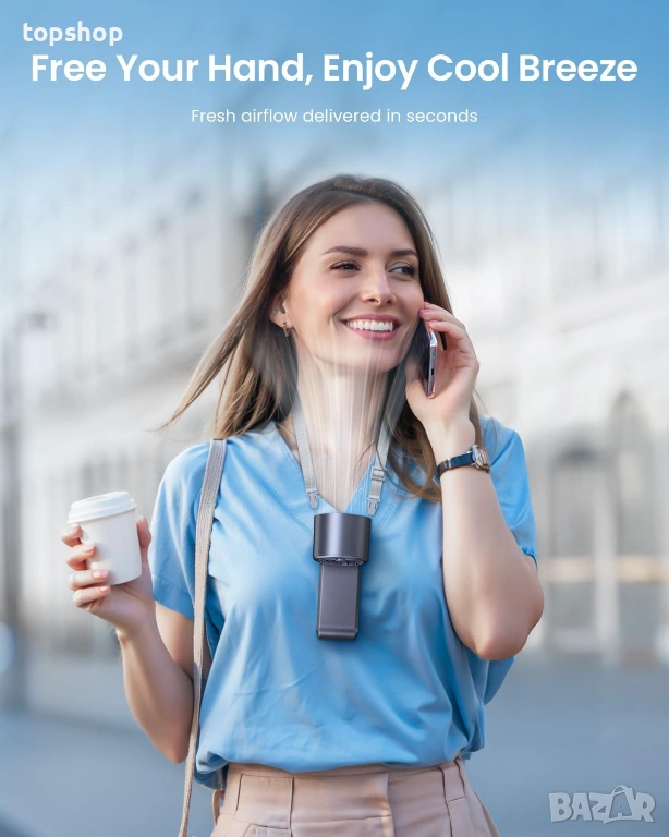 3-в-1 дизайн: Може да се държи в ръка, да се постави на бюро като настолен вентилатор или да се носи на врата чрез включената връзка (Lanyard).