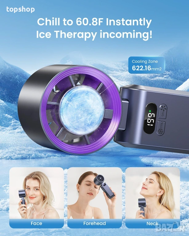 Технология с леден ефект (Ice Cooler): В центъра на вентилатора има метална плочка, която изстива моментално. Може да се допира до кожата (чело, врат) за мигновено разхлаждане в горещините.