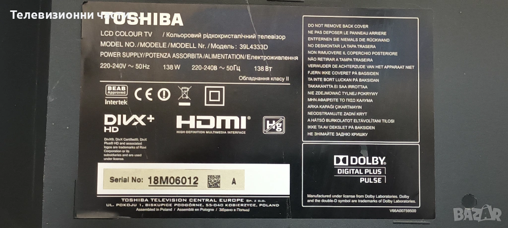 Toshiba 39L4333D с дефектен екран 96.39S02.002 T390HVN01.0/32L4300 REV:1.02/B191-102 D04 REV.C 4H → Обява 53444015