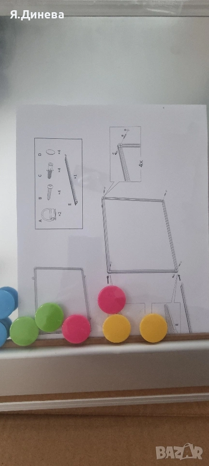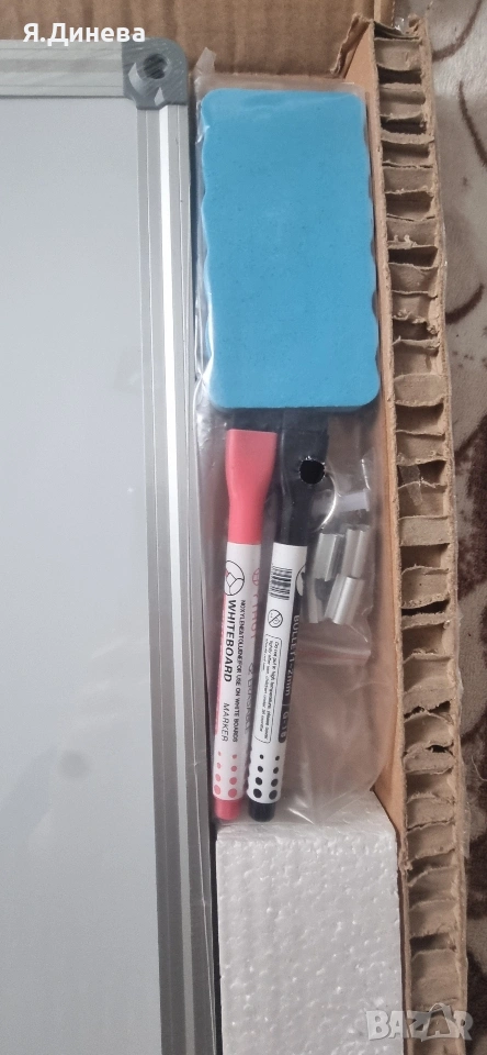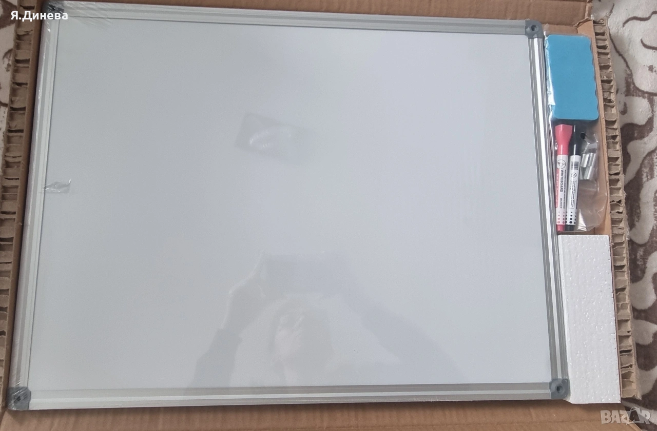 Продавам чисто нова дъска за писане с маркер. Дъската е с 2 лица от едната страна се пише с маркери а отдругата страна може да се закачат бележки с магнитчета. В комплекта има дъска,маркери,гъба за триене и магнитчета. Дъската няма стойка, закача се на стената. Внос от Германия.