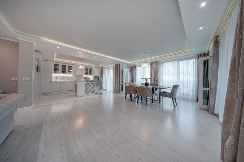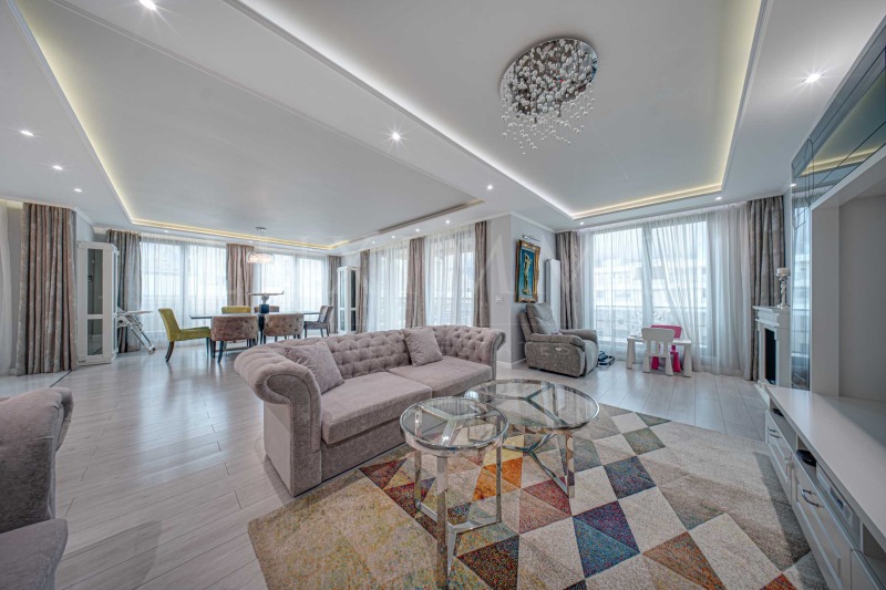 Апартаментът е обзаведен с висок клас материали и оборудван с всички необходими електроуреди. Интериорът е реализиран по дизайнерски проект, детската стая е обзаведена с мебели Cilek. Трапезната маса и столовете са от Kare, баните са изпълнени с решения на Keramo, а меката мебел в дневната е изработена по индивидуална поръчка.