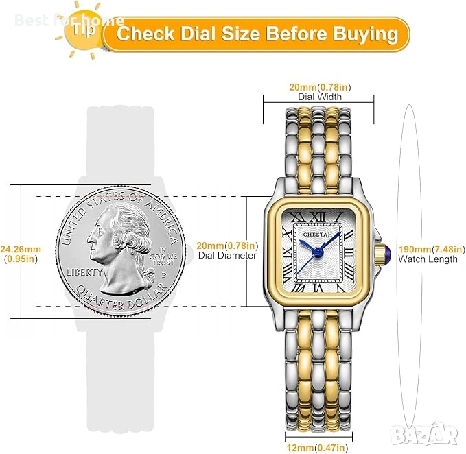 【Малък дизайн】Този златен квадратен часовник за жени е проектиран с по-малък корпус: дължина на корпуса: 0,79 инча, ширина на корпуса: 0,72 инча, отличава се с елегантен дизайн, подчертан от стилната му каишка, перфектно допълващ всяко облекло - от ежедневно до официално.