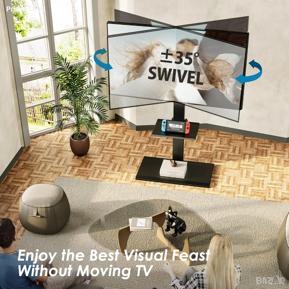 * Гъвкаво позициониране (Swivel): Стойката позволява завъртане на екрана до 70° (±35° наляво и надясно), осигурявайки оптимален зрителен ъгъл от всяка точка на помещението, без да се налага преместване на цялата конструкция.