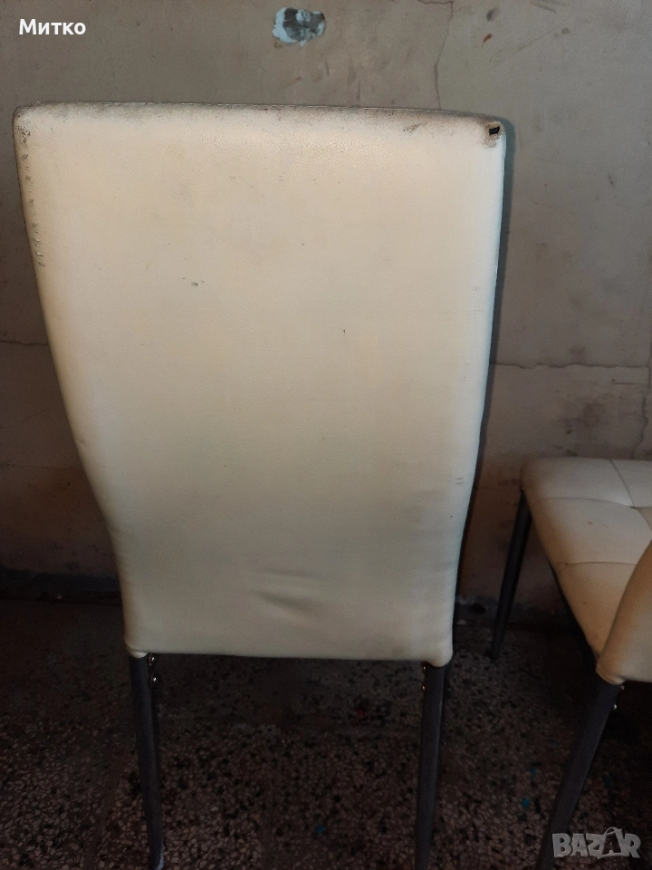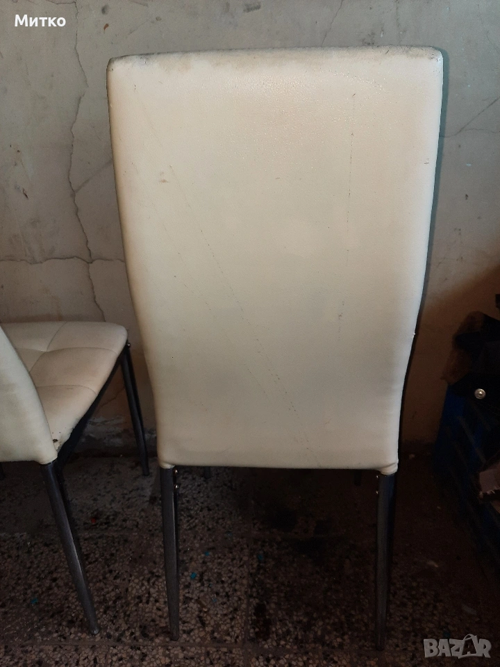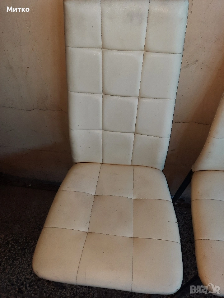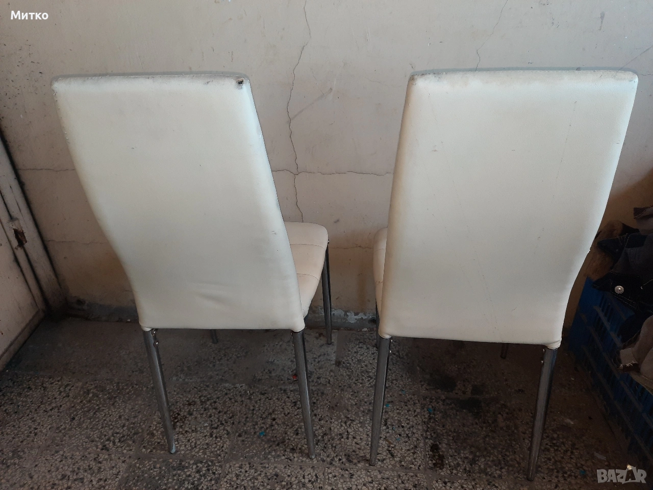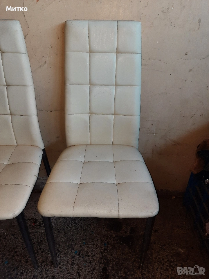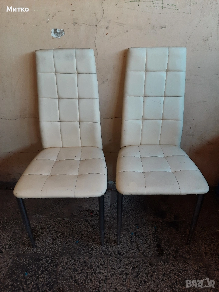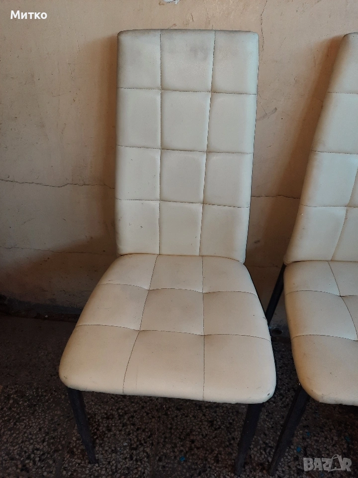 Здрави трапезни столове с облегалка и бяла кожена тапицерия с желязна основа.Столовете имат леки забележки по тапицерията.Размерите ги има на снимките.Височина 95см със облегалката. височина до седалката от земята 44 см.ширина на седалката 40см дължина на седалката 42см.Цената е 8 евро за 1брой стол.