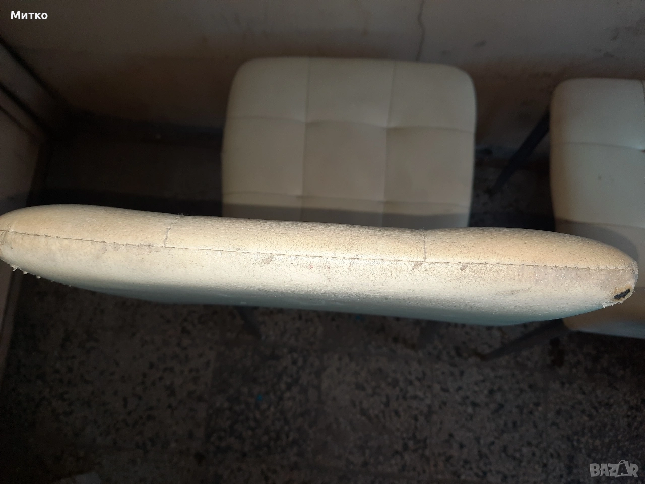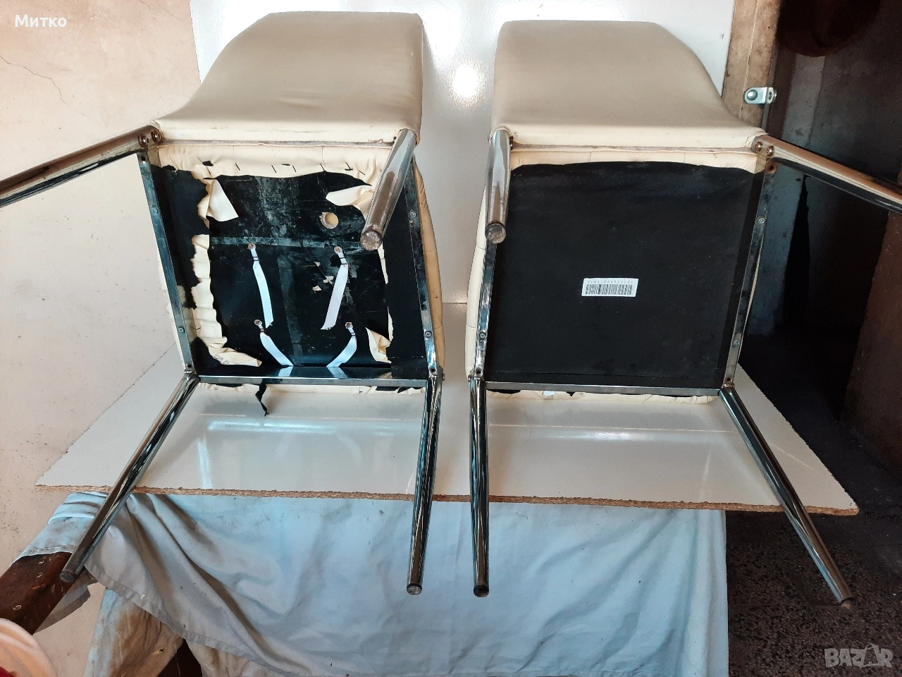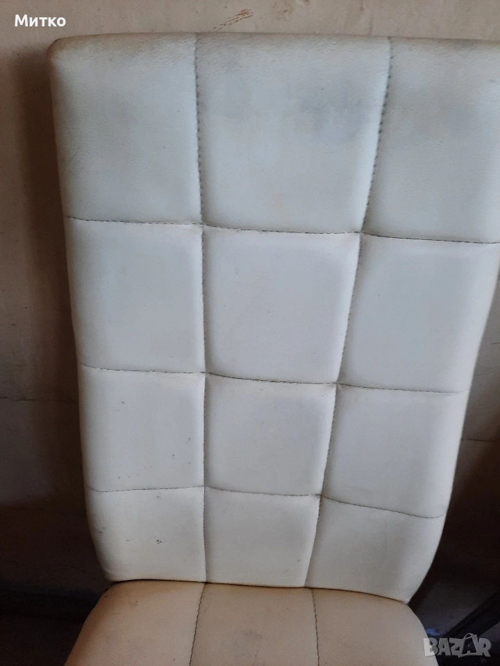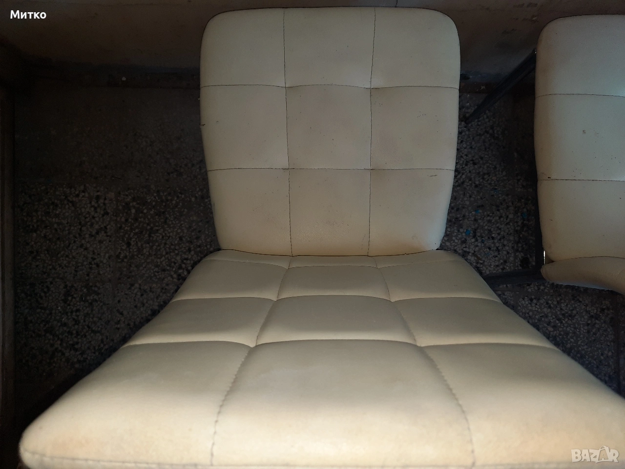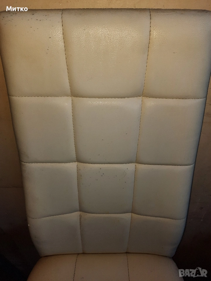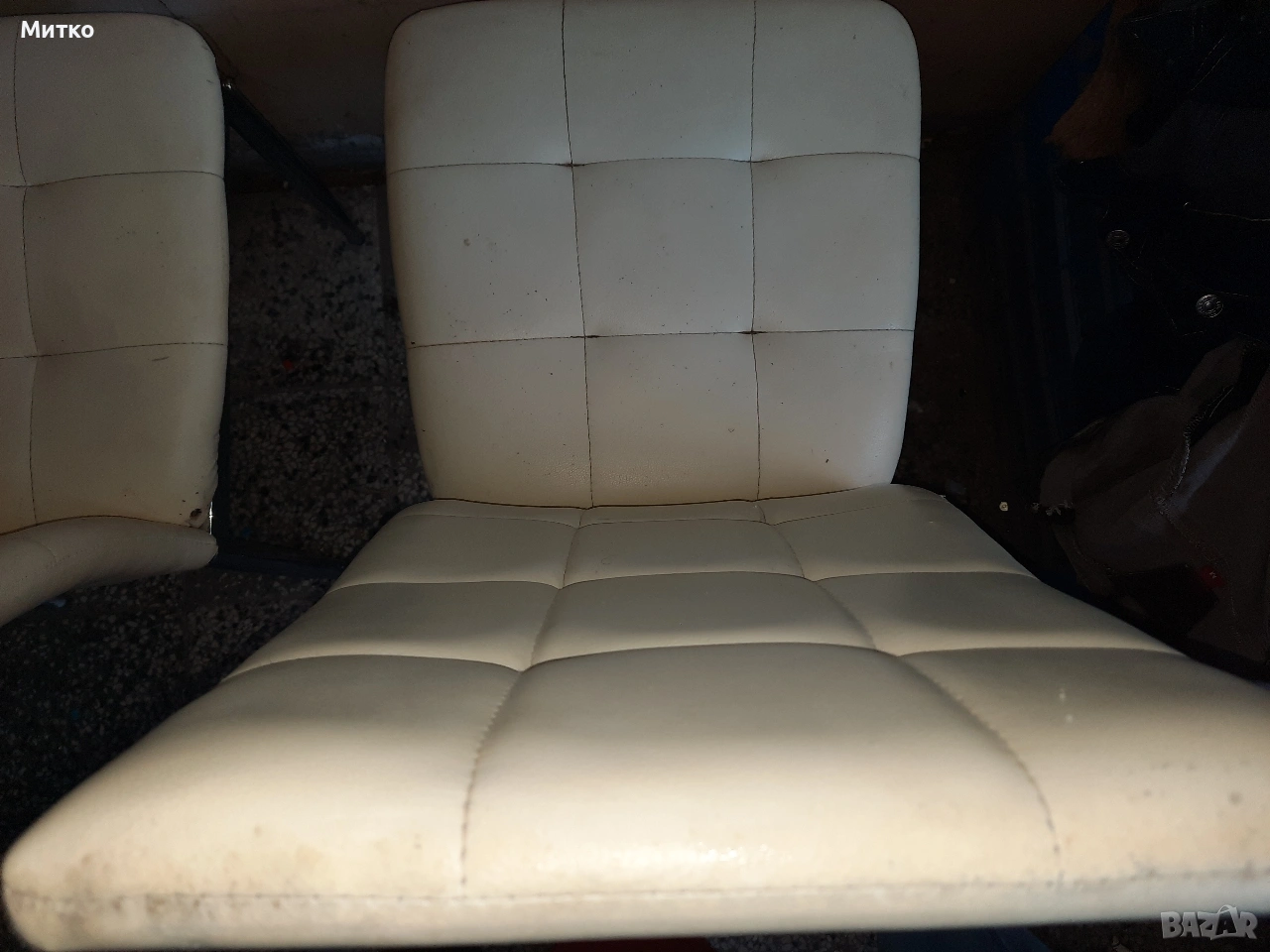 Здрави трапезни столове с облегалка и бяла кожена тапицерия с желязна основа.Столовете имат леки забележки по тапицерията.Размерите ги има на снимките.Височина 95см със облегалката. височина до седалката от земята 44 см.ширина на седалката 40см дължина на седалката 42см.Цената е 8 евро за 1брой стол.
