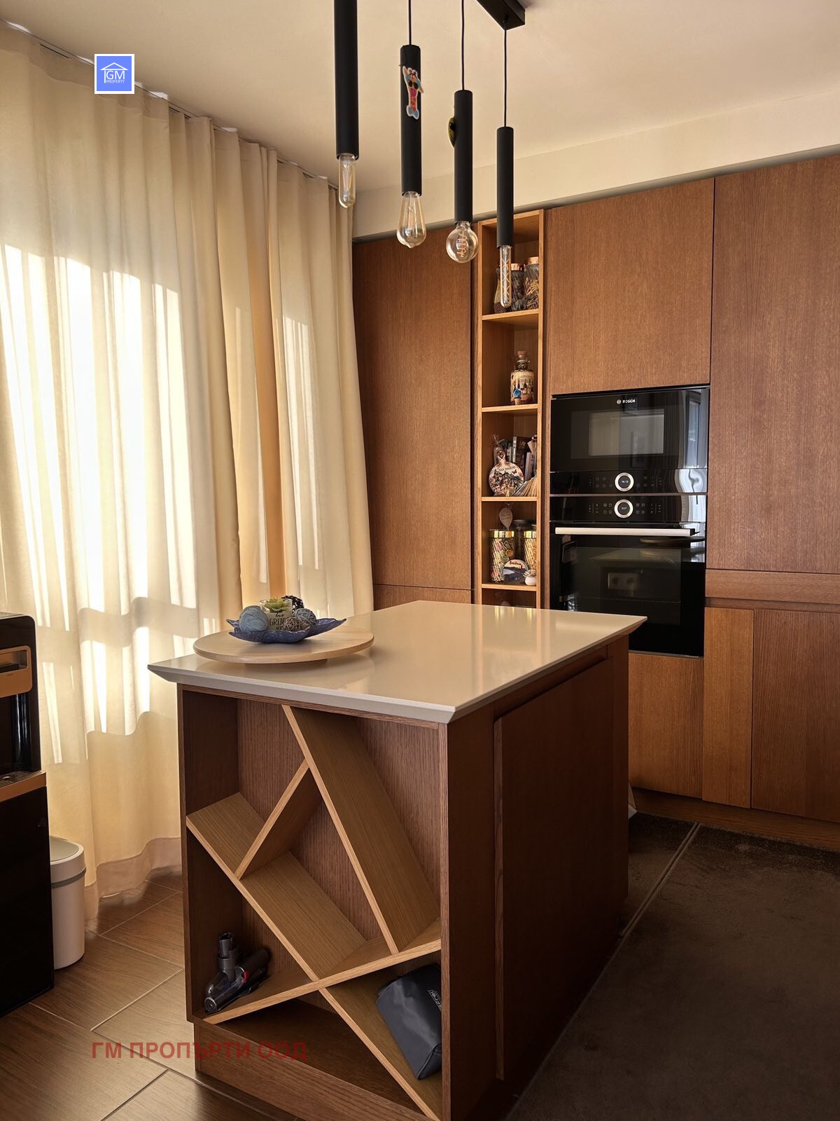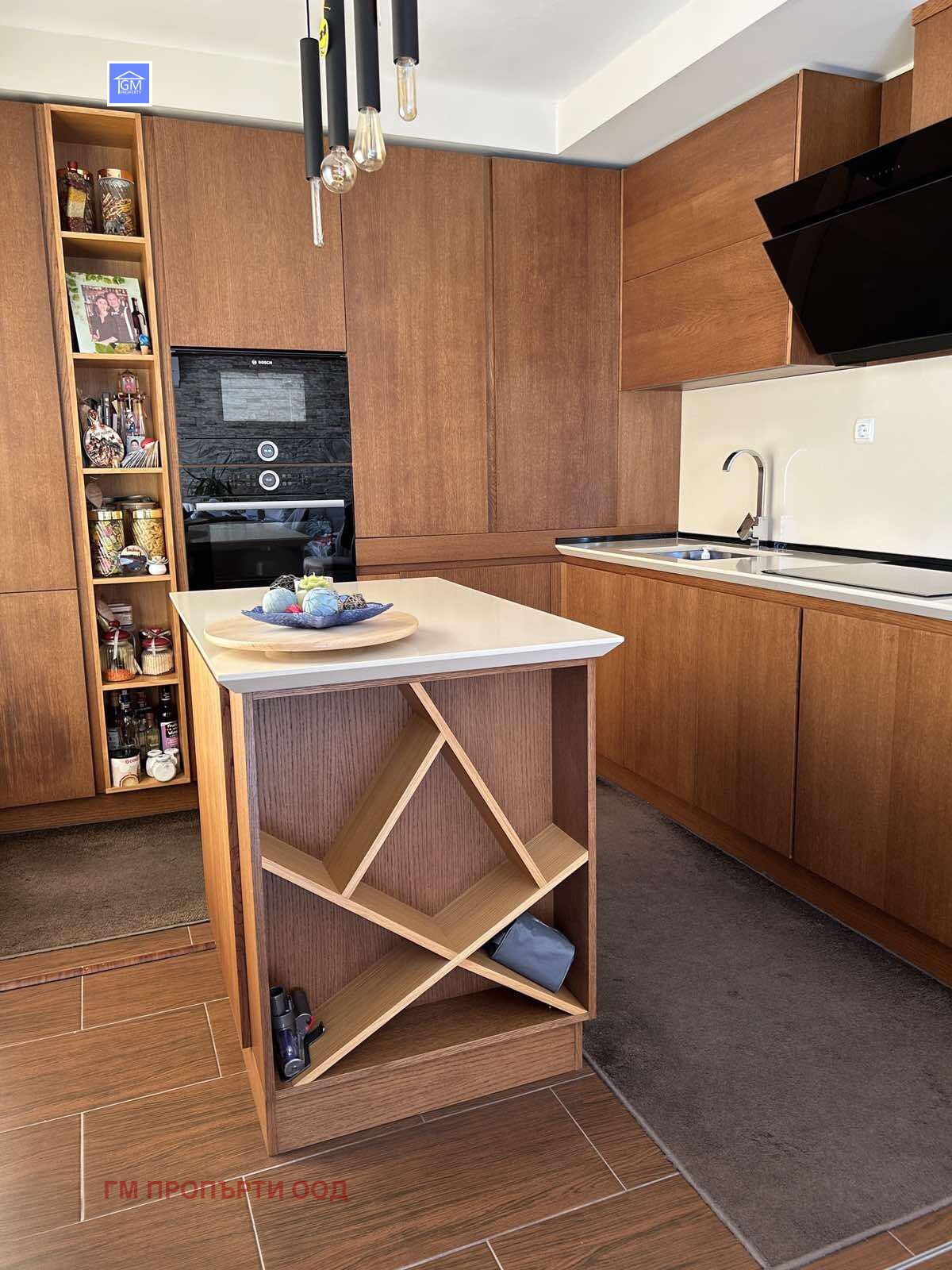 Кухненското оборудване е изцяло вградено с висок клас ел.уреди на Bosch ,плота в кухнята е от технически камък , мебелите в банята са изцяло от естествено дърво . Подовата система е изпълнена в целия апартамент , имотът е слънчев и топъл с източно изложение