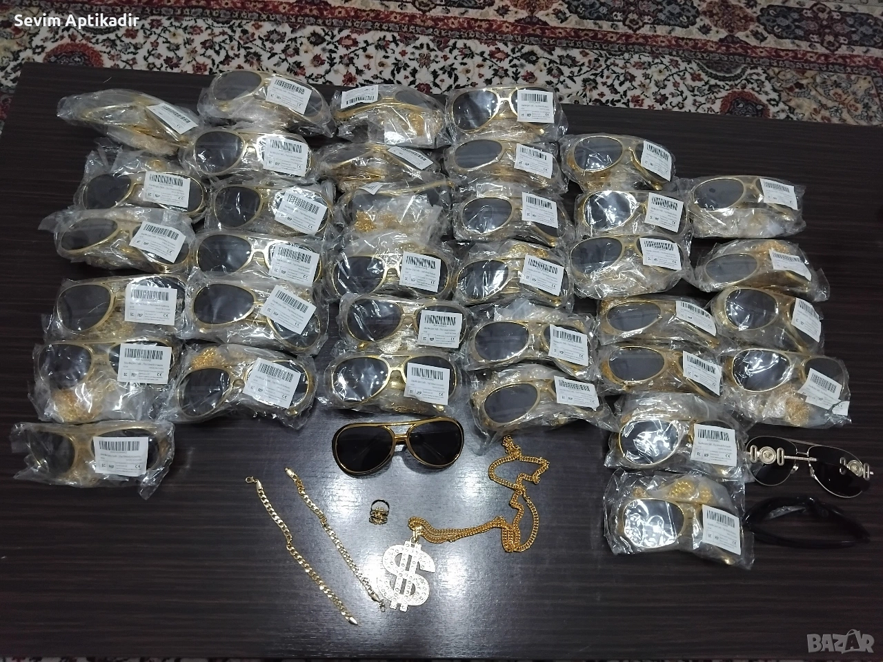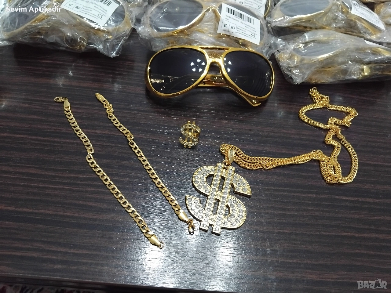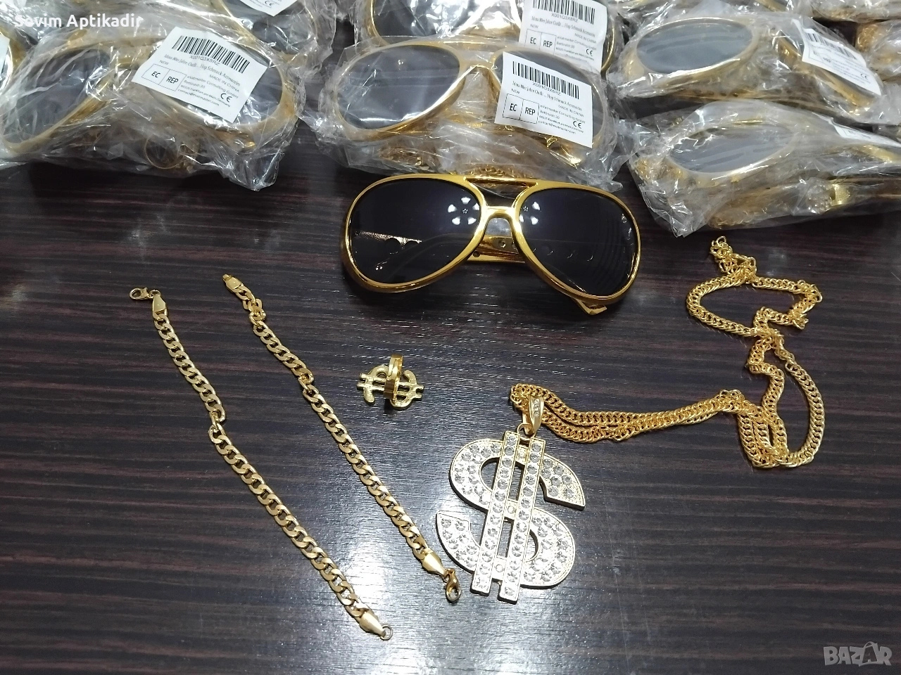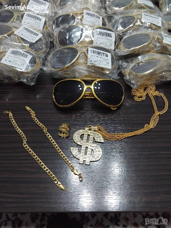 Предлагам комплекти очила със колие висулка със медальон със знака на долара пръстен и два позлатени ланеца синджири които могат да се носят заедно и поотделно.Комлектите са нови внос от Белгия без забележки.