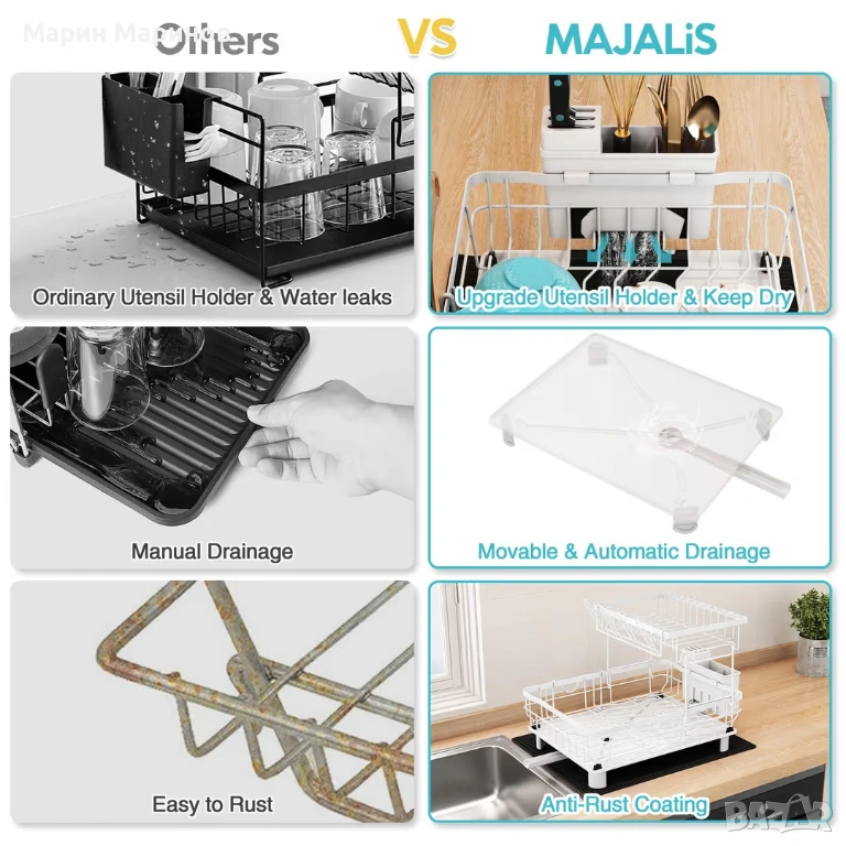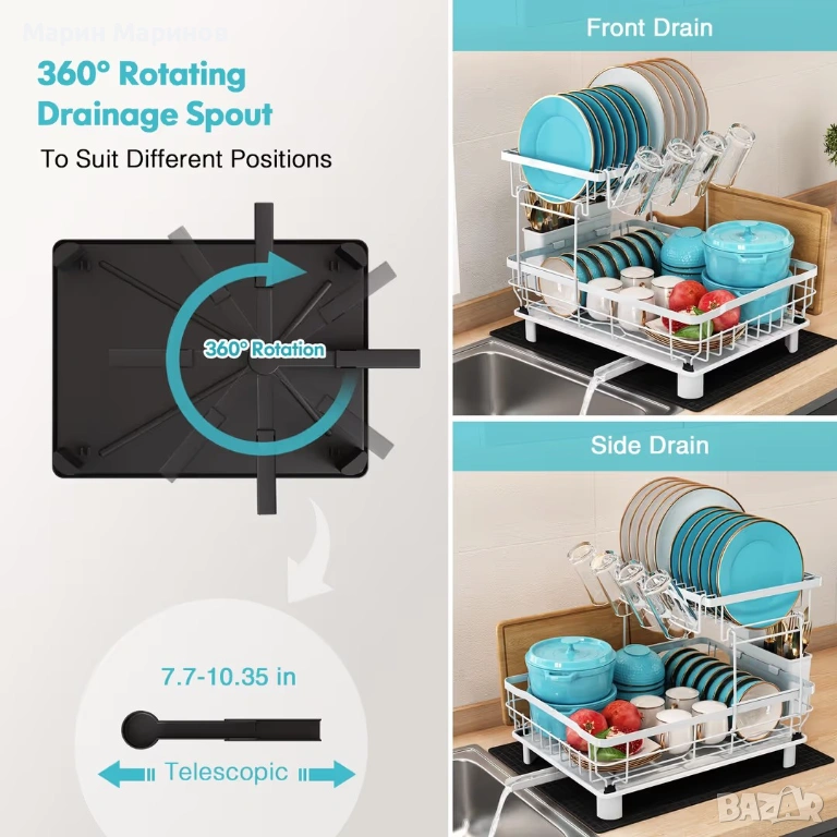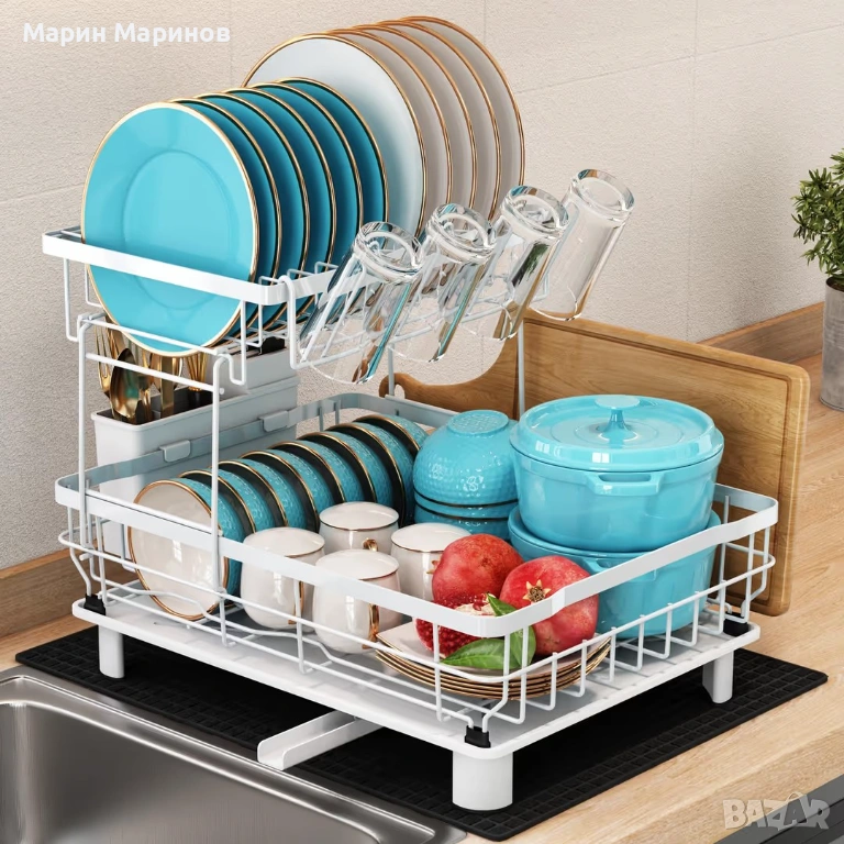 Сушилня за съдове 2 нива от неръждаема стомана с подложка и държач за прибори – Бяла → Обява 53445869