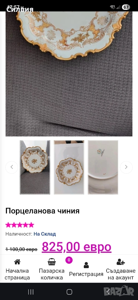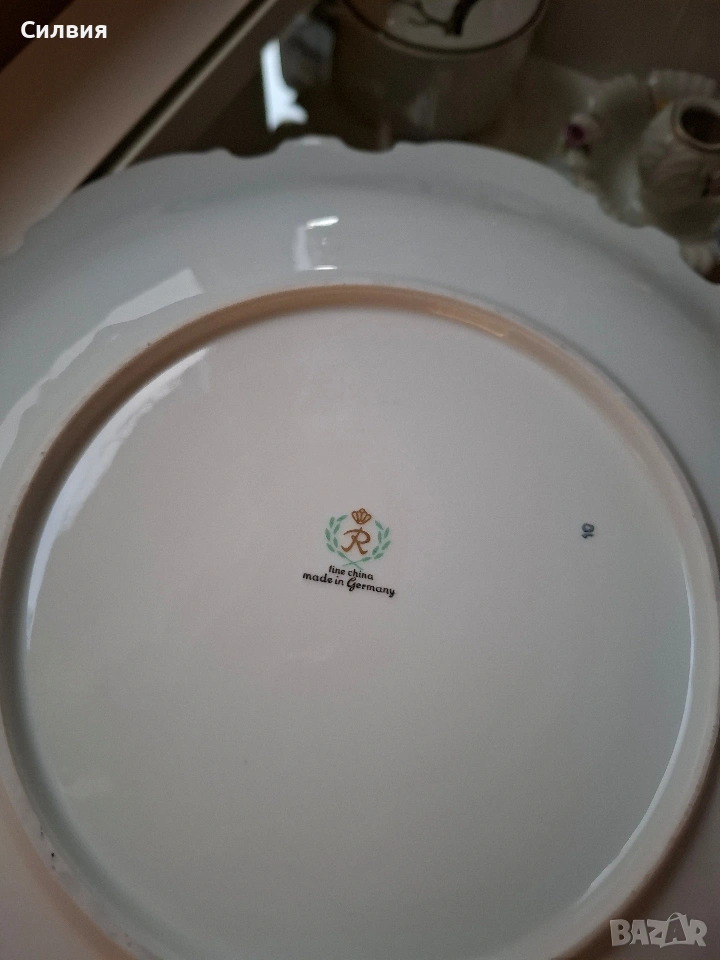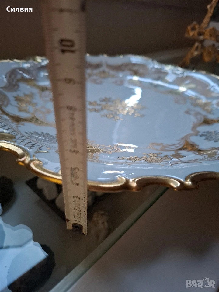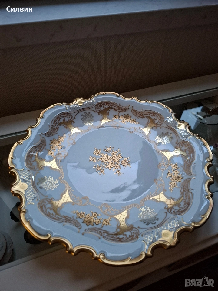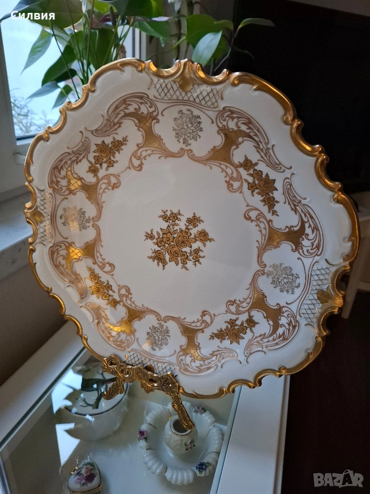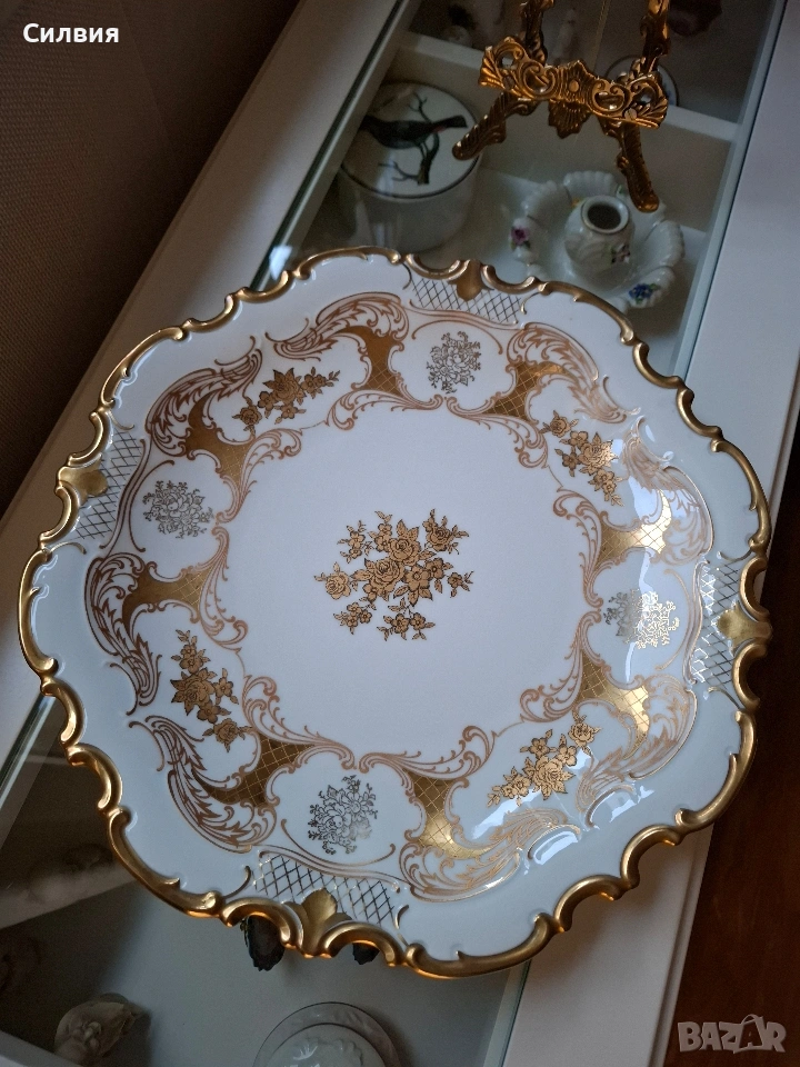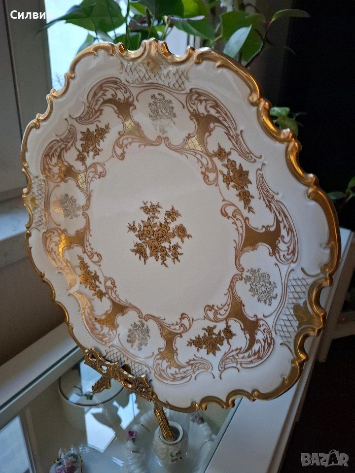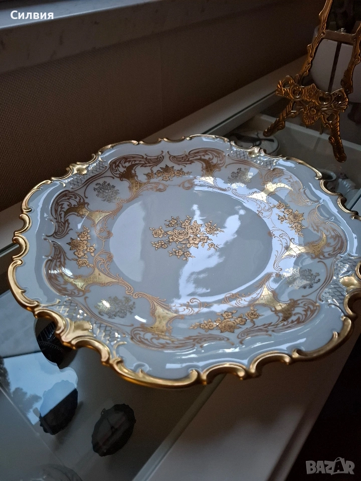 Голямо плато Reichenbach (32.5 см) – 24к ецвано злато Кралски разкош! Това не е само чиния, а произведение на изкуството, изработено по технологията "Echt Ätzgold" (истинско ецвано злато). Декорацията е релефна, с изключителна детайлност на флоралните мотиви и бароковите орнаменти. Материал: Фин костен порцелан (Fine China). Декор: Богата позлата 24 карата, ръчна обработка. Диаметър: 32,5 см (най-големият размер за модела). Маркировка: Оригинален печат на Reichenbach, произведено в Германия. Предмет с висока колекционерска стойност, чиято цена в международни галерии варира значително (вижте справка в снимките). Изключително подходящ за ценен подарък или за акцент в аристократичен дом. Моделът е високо ценен в международни антикварни аукциони, където цената му достига стотици евро (виж последната снимка)." Маркировка: Оригинален печат на Reichenbach, произведено в Германия. Изключително запазено състояние, със сияйна позлата и без наранявания – истинска антикварна находка. Цена 1️⃣1️⃣0️⃣€ 《215,14лв 》•✽✧✽•°”˜🦋”°•✽✧✽•°”˜🦋”°•✽✧✽•°”˜🦋”°•✽✧✽•°”🦋˜”°•✽✧✽•