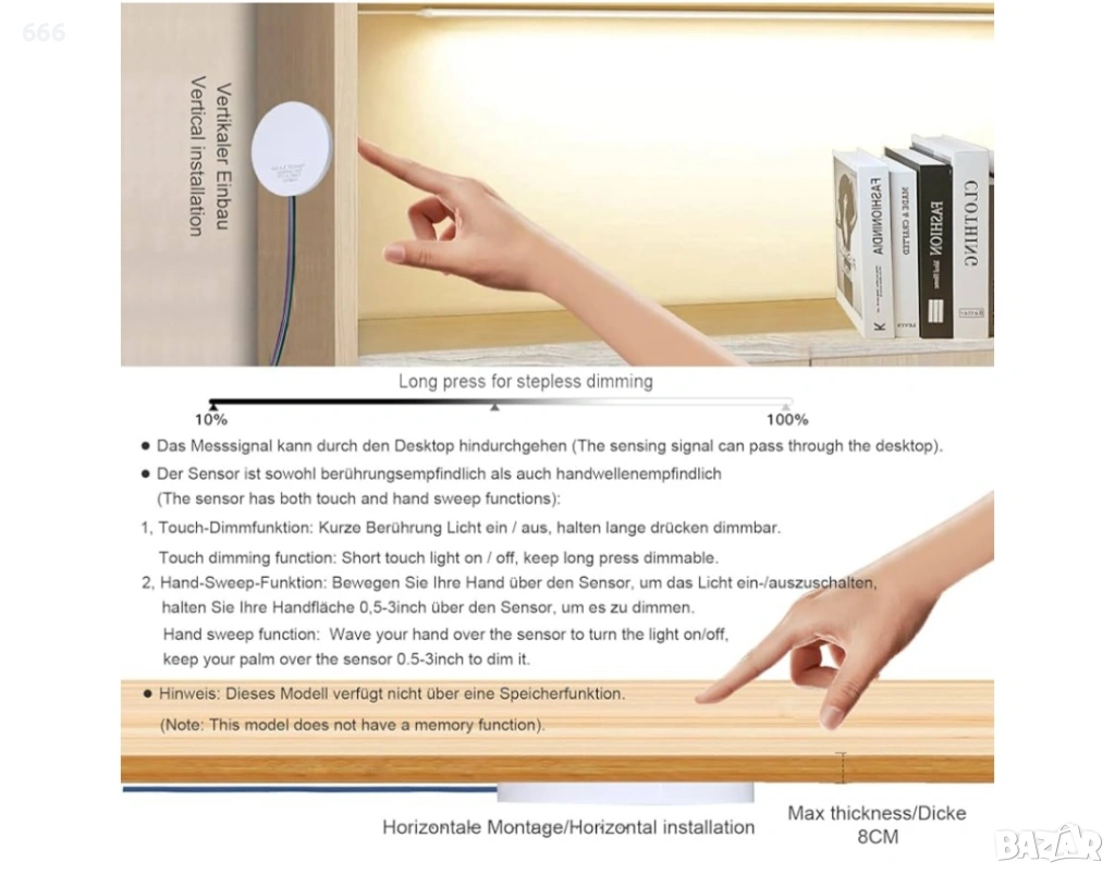 Подобрена версия на сензорен превключвател: Максимална дебелина до 5 см, Сензорният сигнал може да проникне през дървени панели, каменни панели, камък, хартия, акрил, пластмаса, стъкло и други неметални материали (не е приложимо за огледала), Различната чувствителност е различна, колкото по-тънка, толкова по-добре, Моля, не близо до метални материали, за да избегнете смущения.