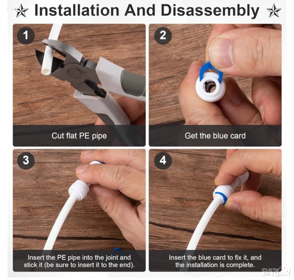 【Лесен за инсталиране】Не са необходими инструменти: Не са необходими други инструменти, просто поставете тръбата в дъното, за да я свържете или разкачите бързо. Можете лесно да инсталирате или разглобите дори от начинаещи. 1, Отрежете плоската PE тръба. 2, Вземете синята карта. 3, Поставете PE тръбата в съединението и я залепете (не забравяйте да я поставите до края). 4, Поставете синята карта, за да я фиксирате, и инсталацията е завършена.