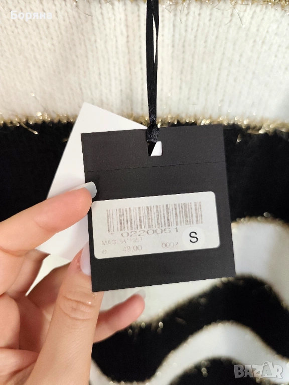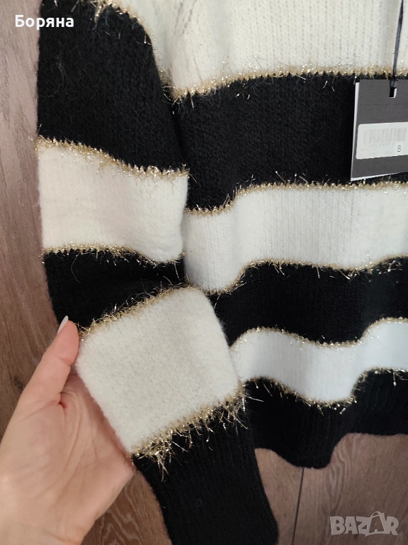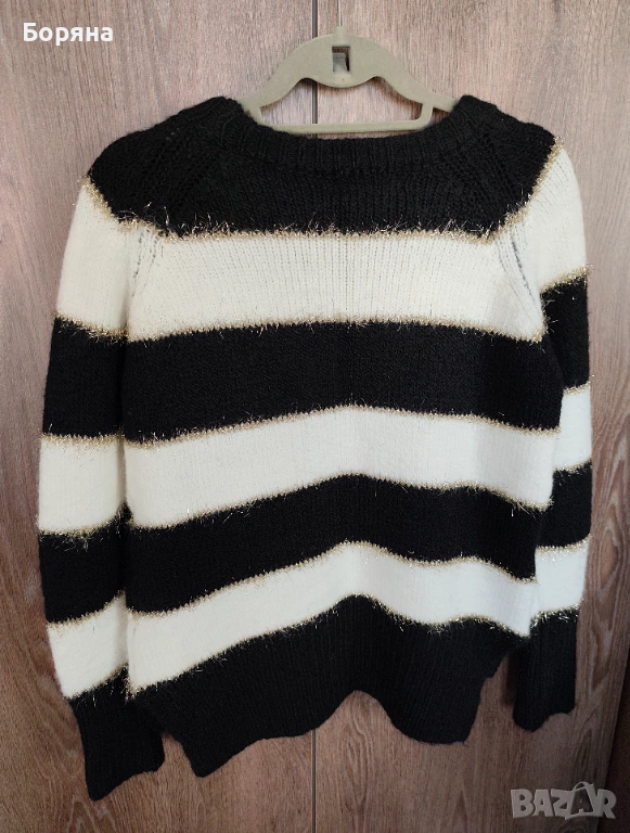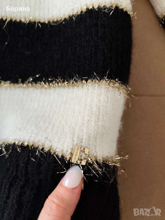 Меко и топло плетиво с 30 % вълна в състава, черно бяло райе с лека златиста нишка за акцент.