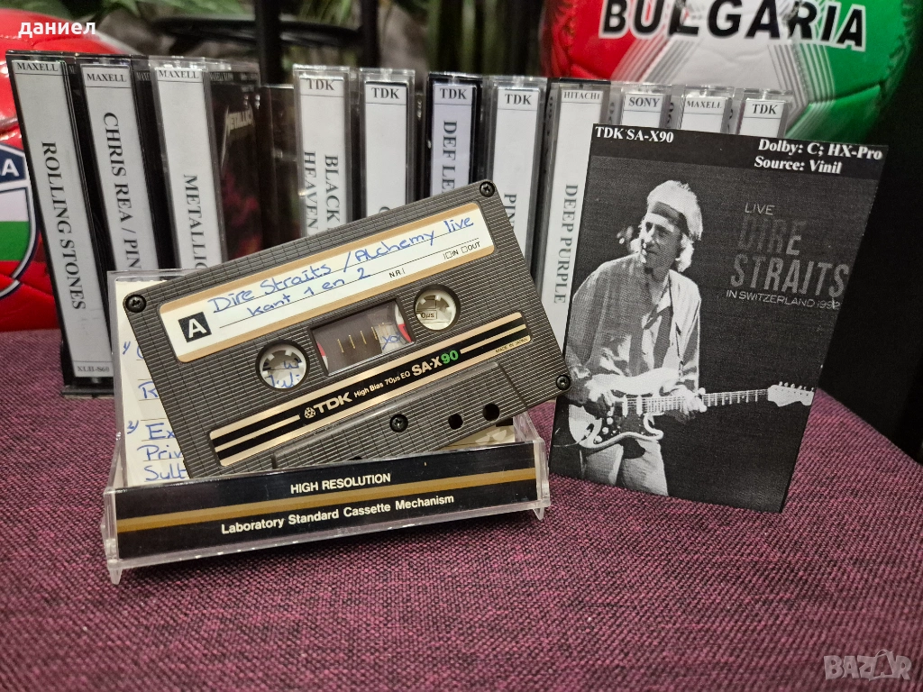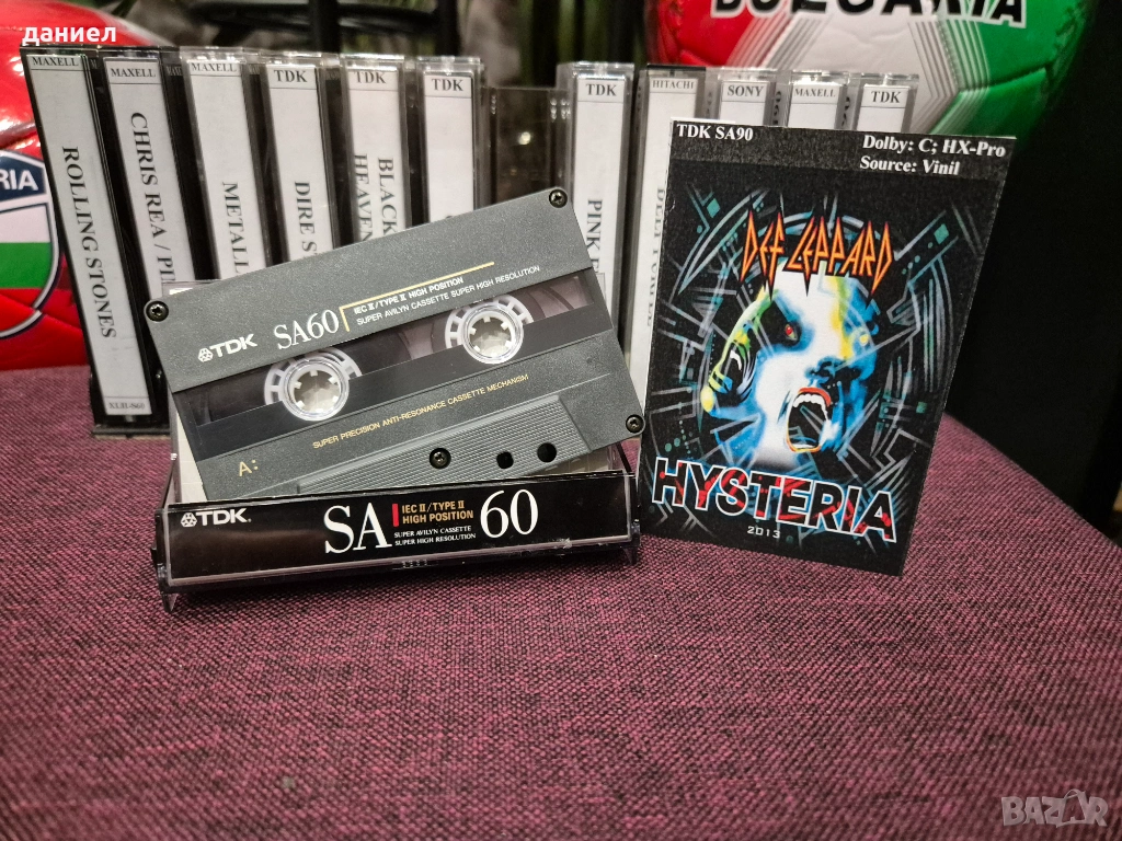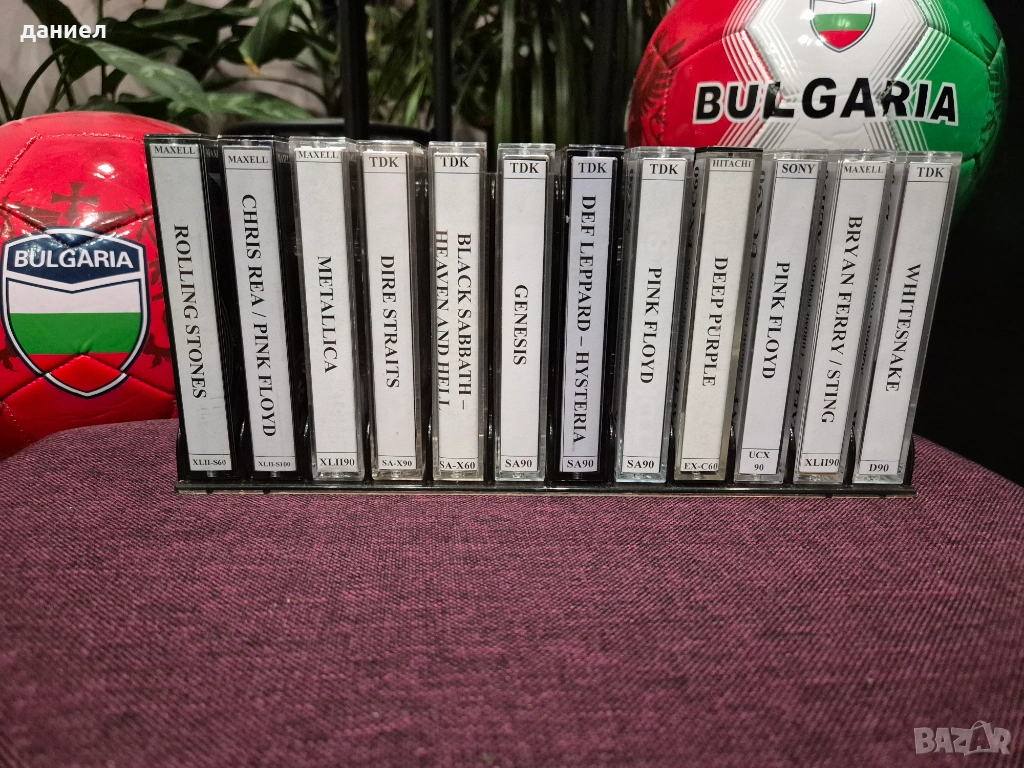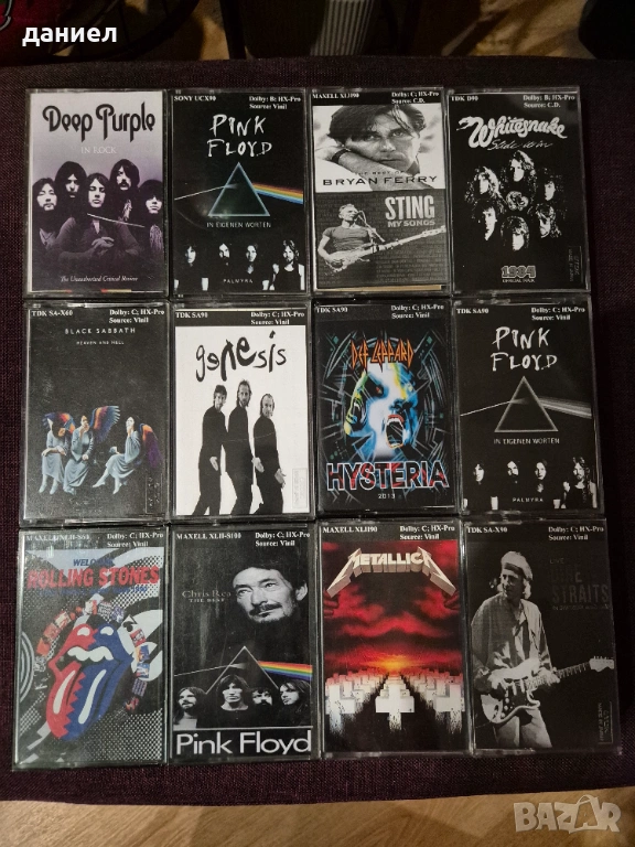 12 бр. различни модели качествени аудио касети TDK, MAXELL, SONY, HITACHI 60/90/100 с готина рок музика. Много добро качество на записите - има на Deep Purple, Whitesnake, Pink Floyd, Rolling Stones, Metallica, Dire Straits, Black Sabbath, Def Leppard, Sting и такива подобни. Лентата е отлична, а касети, кутии и обложки са много запазени (някои от касетите и обложките са надписани). При покупка имайте предвид, че това все пак са използвани касети. Цената за всичките 12 касети е 50 евро + подарък още една касета HITACHI DL60 със запис на Bad Boys Blue (последната снимка).