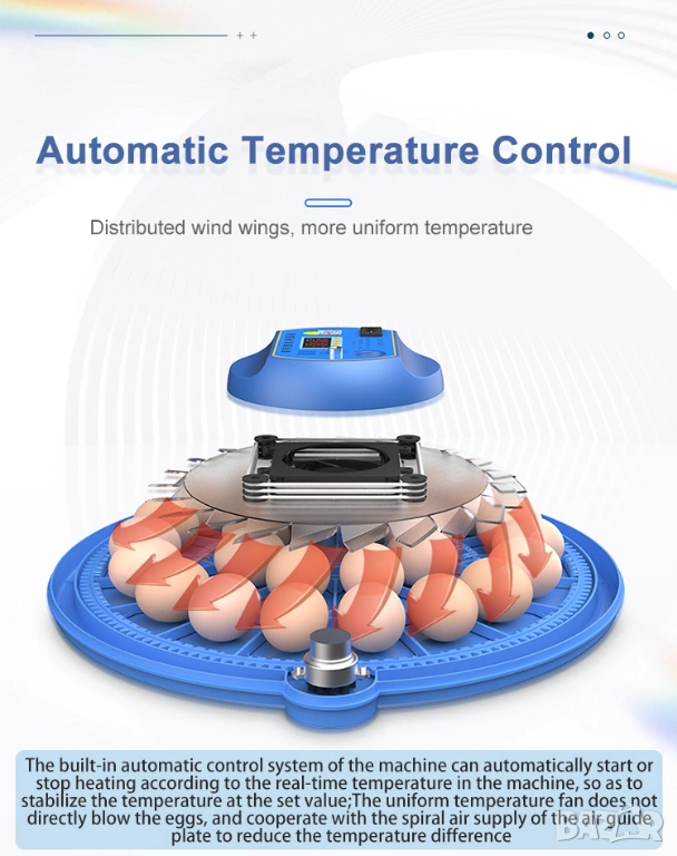 Този високоефективен инкубатор е създаден за любители и малки стопанства, които търсят надеждно решение за излюпване на птичи яйца в домашни условия. Подходящ е за кокоши, патешки, гъши, пуешки и пъдпъдъчи яйца, като предлага напълно автоматизиран процес с много висок процент на излюпване – до 98% при спазване на правилните условия. Благодарение на компактните си размери и ниското тегло, инкубаторът може лесно да се постави в различни помещения и да се използва както у дома, така и в малки ферми.