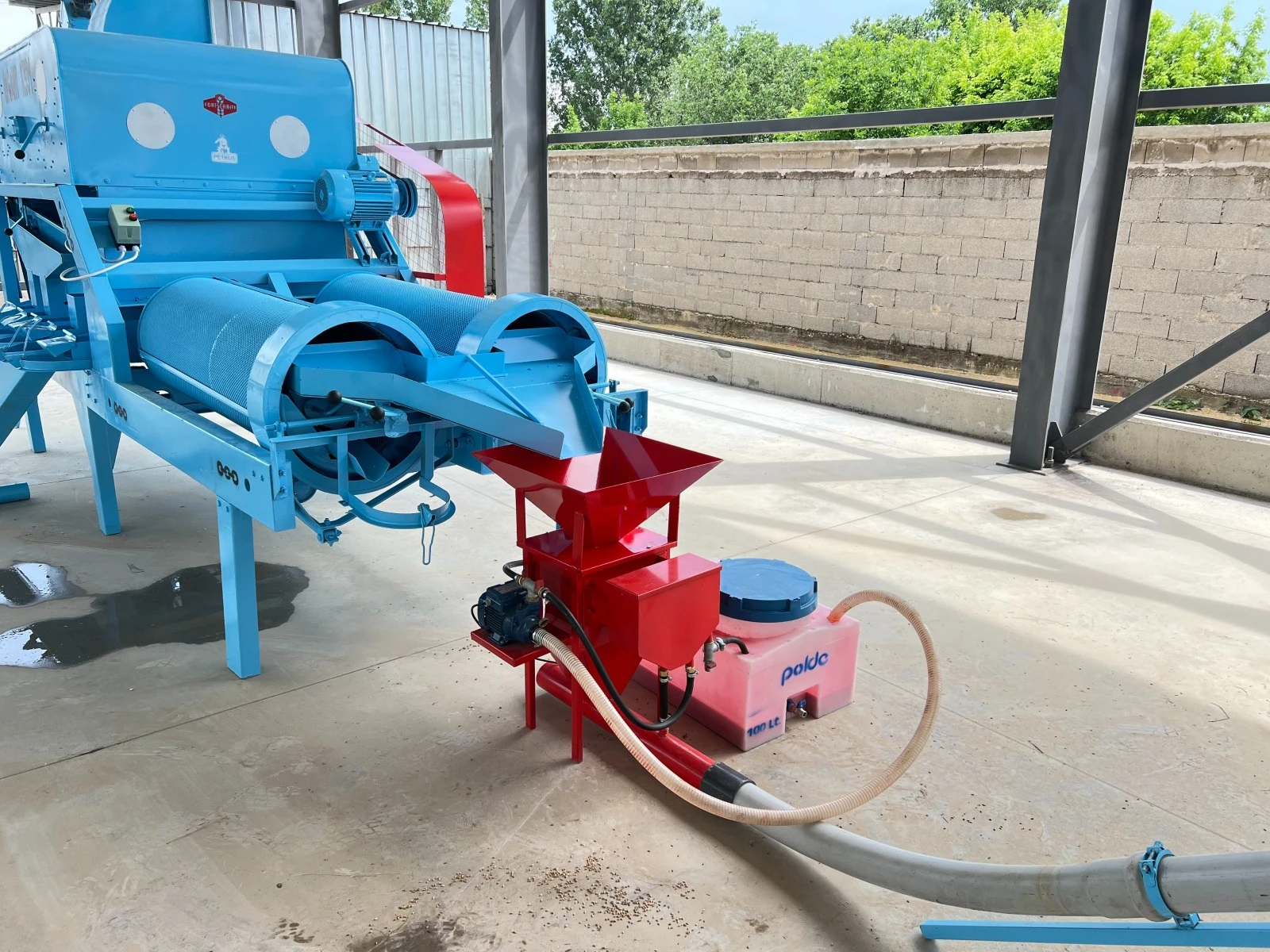 Нашата нова автоматизация за машините Super K541 / Gigant K531 премахва ръчния труд като: Mашинатa се зарежда с шнеков транспортьор. Примесите се отстраняват с винтов товарач. Чистият материал се товари или третира с втори шнек в ремарке или биг-бег, всичките допълнителни машини са предвидени според производителността на семечистачната машина. Линията вдига производиелността на машината с над 2 тона на час (пшеница), освен пшеницата може да се чистят всякакви култури, като започнем от люцерна и рапица и стигнем до боб, нахут дори и арпаджик. Като допълнение линията за почистване на семена може и да обеззаразява семената за 24 500 лв. Линията за почистване на семена включва: Семечистачна машина + триор за калибриране на семената (Gigant K531) - 4 кВт Захранващ зърнотоварач (ПВЦ щадящ шнек) - 0, 75 кВт Шнек за от отсевките с приемна пола (ПВЦ щадящ шнек) - 0, 55 кВт Допълнителна опция: Машина за третиране на семена с отхранващ шнек (Машина за обеззаразяване на семена с шнек) - 0, 37+0, 75 кВт (+2100 лв. ) Може вместо обеззаразителя на семена да се използва просто отхранващ шнек (ПВЦ щадящ шнек) - 0, 75 кВт И две стойки за Биг-Бег