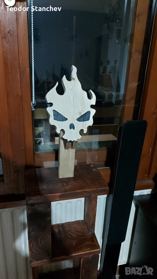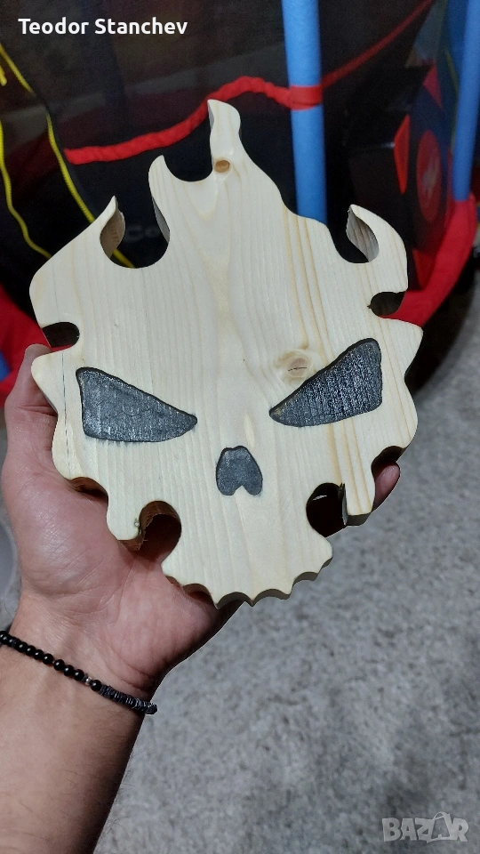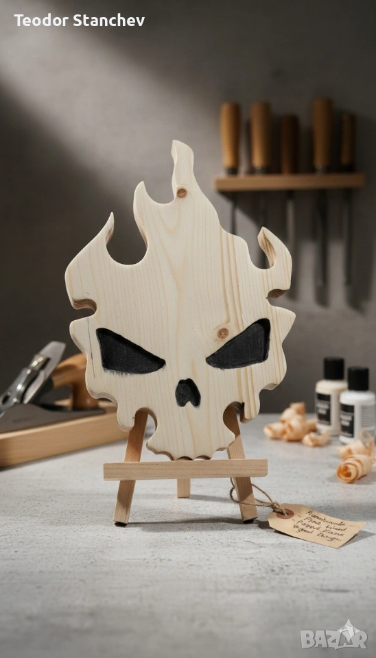 Търсите нещо нестандартно, което да придаде характер на вашия интериор, гараж или ателие? Тази дървена табела е съчетание от агресивен стил и майсторска изработка. Основни характеристики: * Материал: Висококачествено масивно дърво с красива естествена текстура. * Дизайн: Авторска форма на пламтящ череп с прецизно изрязани детайли. * Изработка: Изцяло ръчна работа – от оформянето до финалното шлайфане. * Акценти: Дълбоки черни елементи в областта на очите и носа за по-силен визуален контраст. За кого е подходяща? * За фенове на рок и метъл културата. * За декорация на тематични барове, тату студия или работилници. * За оригинален подарък на човек, който цени hand-made изкуството. Доставка: Изпращам по Еконт/Спиди с опция преглед.