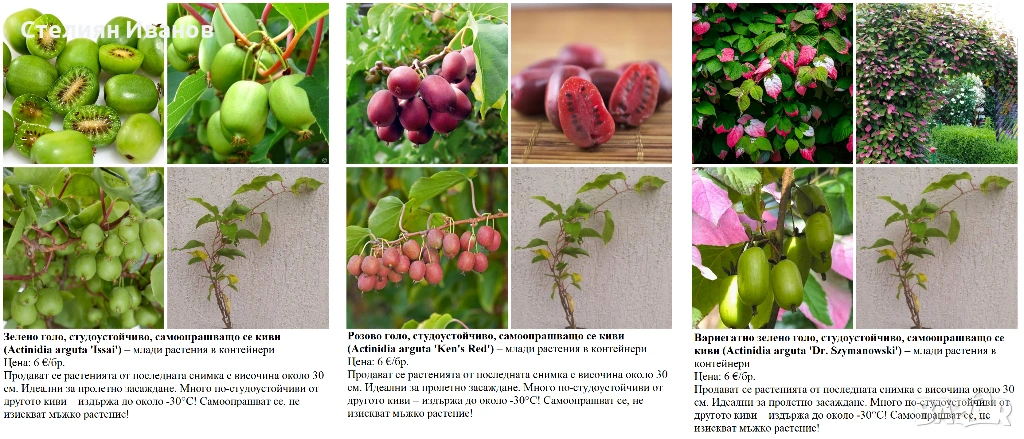 1. Зелено голо, студоустойчиво, самоопрашващо се киви (Actinidia arguta 'Issai') – 6 €/бр.; около 30 см