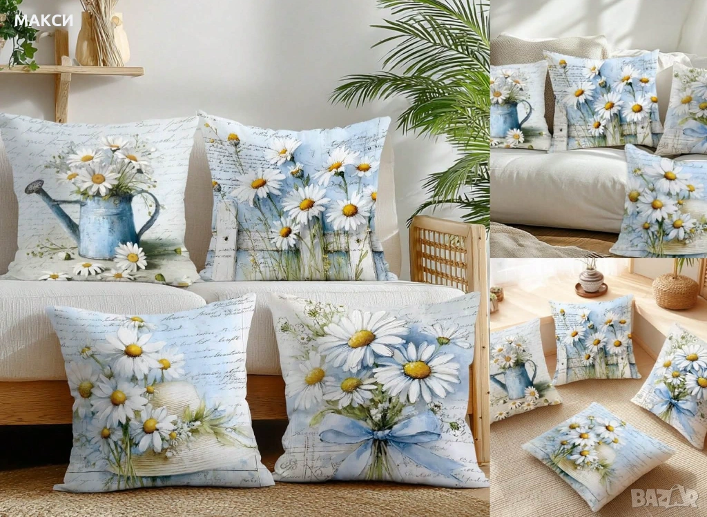 Комплект от 4 бр. декоративни калъфки за възглавници с ципче в красив десен с маргаритки - мека глад, снимка 1 - Възглавници - 53447828 1/1